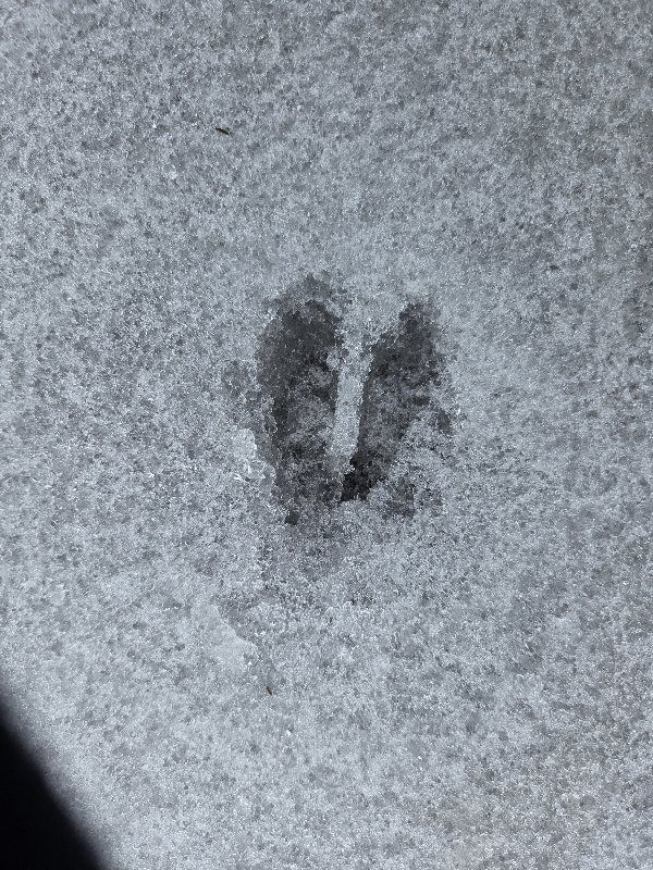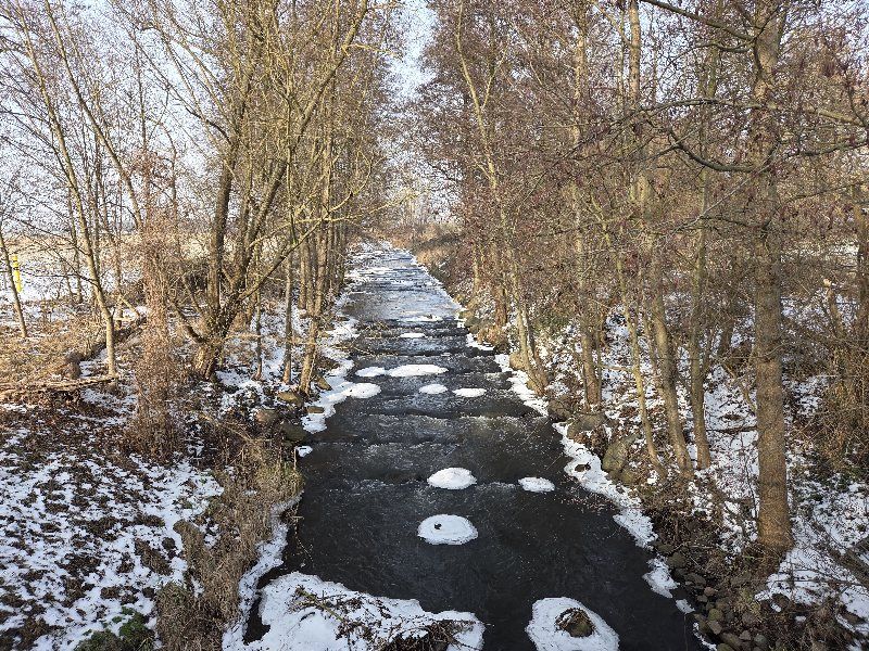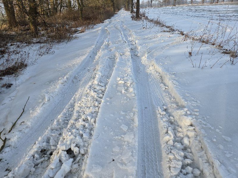 Es ist in der Tat eine Herausforderung auf dem vereisten Weg nicht hinzufallen, was mir aber gelingt. Ich rutsche immer wieder, lerne abzuschätzen, wo es besonders glatt ist und gehe meist am Rand, wo Fahrzeuge den Schnee bzw. das Eis noch nicht glattgefahren haben. Die Stöcke sind sehr nützlich. Die Temperatur ist heute etwas über Null angestiegen, es taut ein ganz wenig. Mich begleitet als einziges Geräusch neben dem Gesang vereinzelter Vögel das Knirschen und gelegentliche Knacken unter den Füßen. Für die verschiedenen Formen dieses Geräuschs bräuchte man eigentlich mehr Wörter. Der Ton ist oft weniger hoch, Knarschen würde da besser passen.