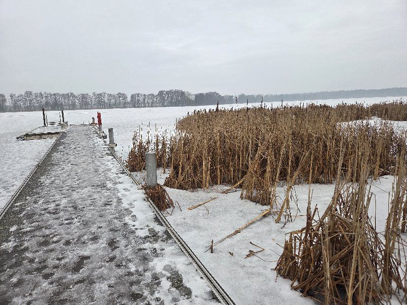Über die Dosse verlasse ich den Ort und komme bald zum Klempowsee, der still und schweigend zugefroren vor mir liegt. Nur wenige Menschen mit Hunden sind auf den vereisten Wegen unterwegs. Ich komme an einer alten Mühle vorbei.