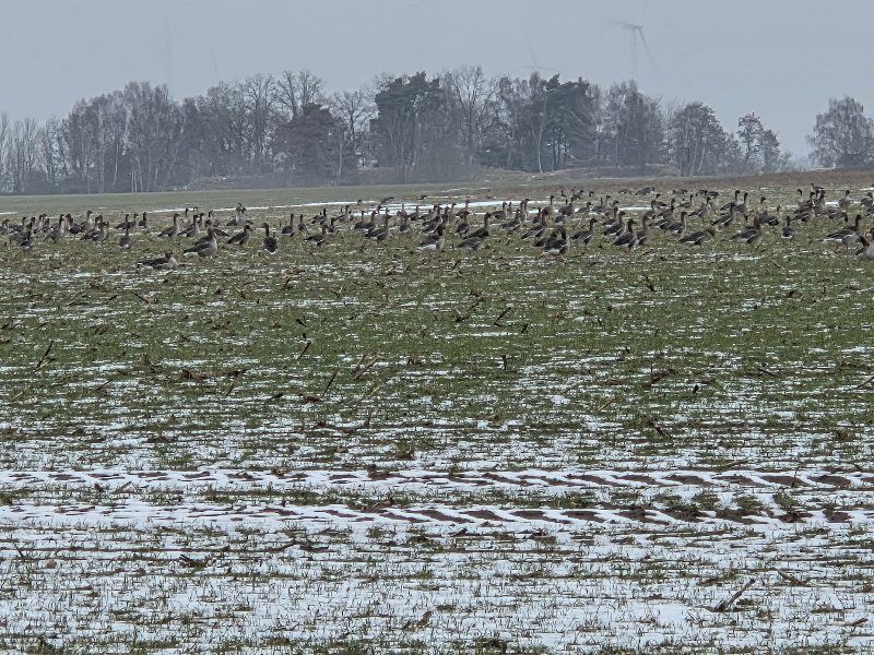 Das Feld vor mir ist überdeckt mit dunklen Punkten, es sind tausende von Kanadagänsen, die sich hier gütlich tun, es ist ja jetzt Tauwetter, da gibt der Boden bestimmt schon etwas von seinen Schätzen frei. Heute ist sowieso der Tag der Vögel. In der Luft hört man immer wieder die röhrenden, trompetenden Rufe, der meist in V-Formation fliegenden Kraniche.