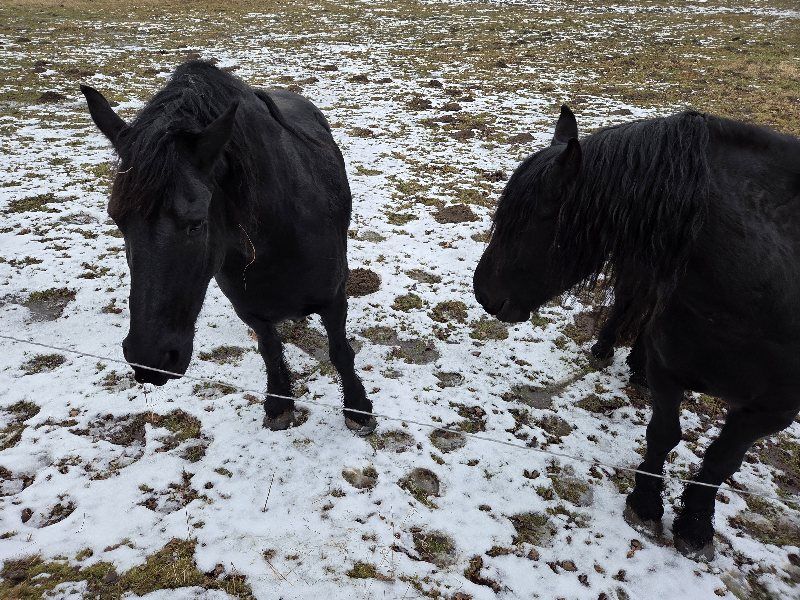 Auf einer Pferdekoppel hinter Rehfeld zwei Schwarze, die mich von weitem erblicken und die ich mit etwas Gras erfreuen kann. Ich bilde mir ein, sie sind genauso einsam wie ich in dieser unwirtlichen, kalten Natur und haben das Bedürfnis nach Körperkontakt.