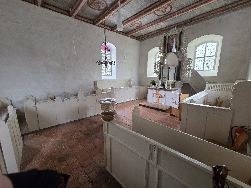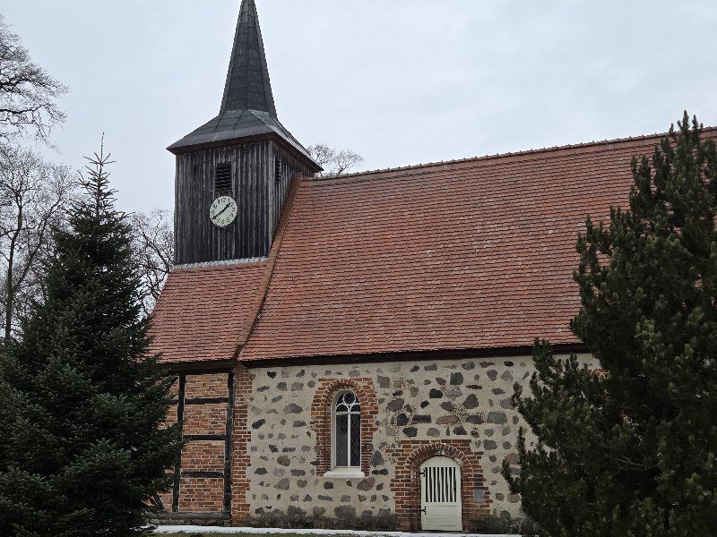 Ich komme nun nach Berlitt, wo es doch tatsächlich eine Offene Kirche gibt, die wirklich offen ist – die in Rehfeld war es nur bis September – wofür ich mich im Gästebuch bedanke, der letzte Eintrag ist von Ende Oktober. Der schlichte, helle Innenraum gefällt mir genauso wie das Äußere der spätgotischen Feldsteinkirche mit Holztürmchen und Schieferhelm.