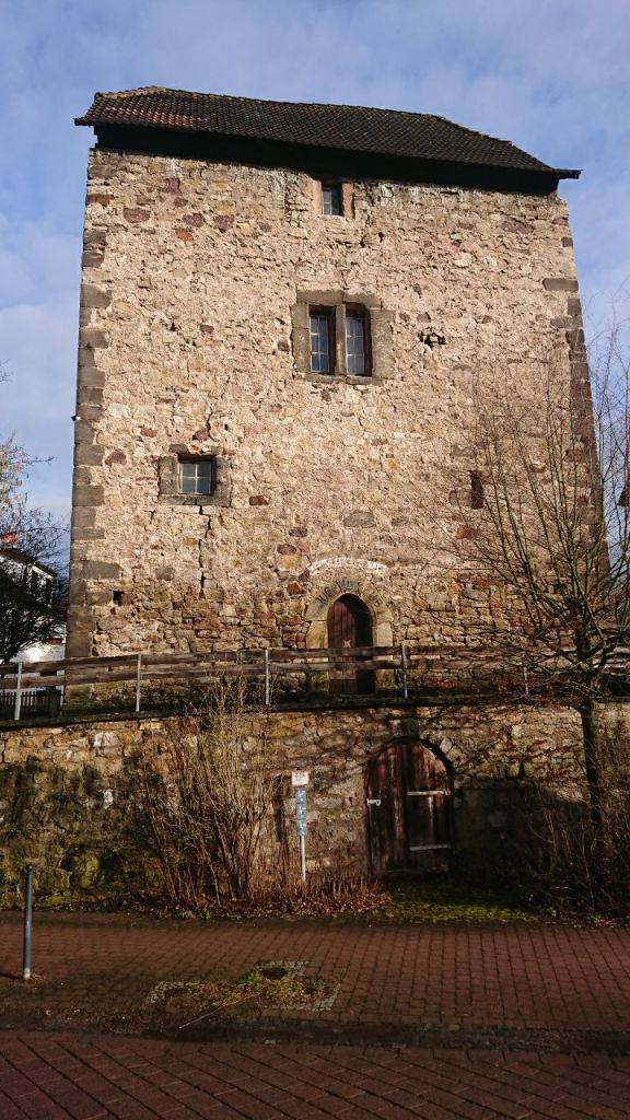 Da es noch nicht einmal ein Uhr ist, mache ich eine Trinkpause auf einer Bank mit Tisch. Es sind doch einige Leute zu Fuß und auf dem Rad unterwegs, es ist ja Samstag. Ich komme nun zur Liboriuskapelle (an der Ostseite der alten Werrabrücke), in der sich Wandmalereien von Elisabeth von Thüringen befinden. Die Kapelle ist (natürlich) geschlossen. Ich sehe später Kopien von ihnen mit guten Erklärungen in der Nicolaikirche im Ort.
