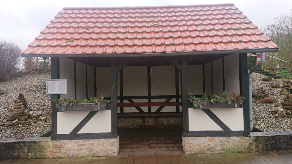 In Lüderbach ist die Kirche mit dem Schnitzaltar natürlich geschlossen. Ich mache meine Mittagsrast mit Gemüse-, Kirschsaft und Ingwerwasser in einem schmucken überdachten Bushaltestellenhäuschen aus Fachwerk.