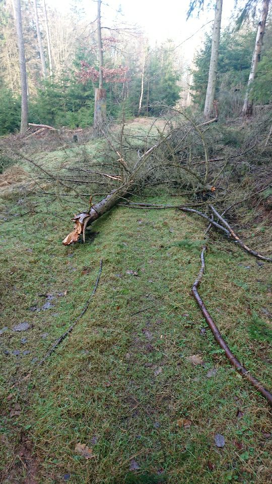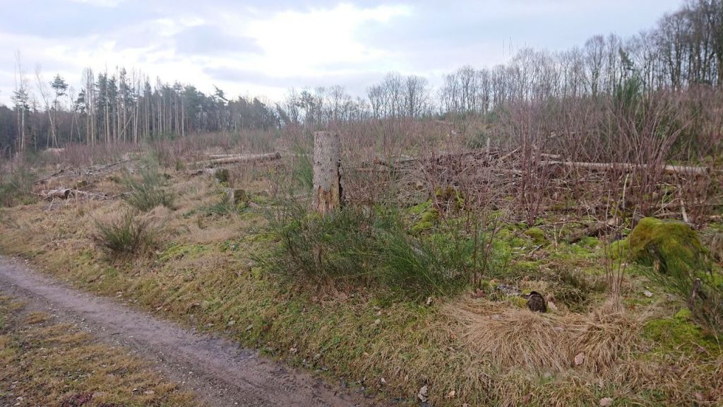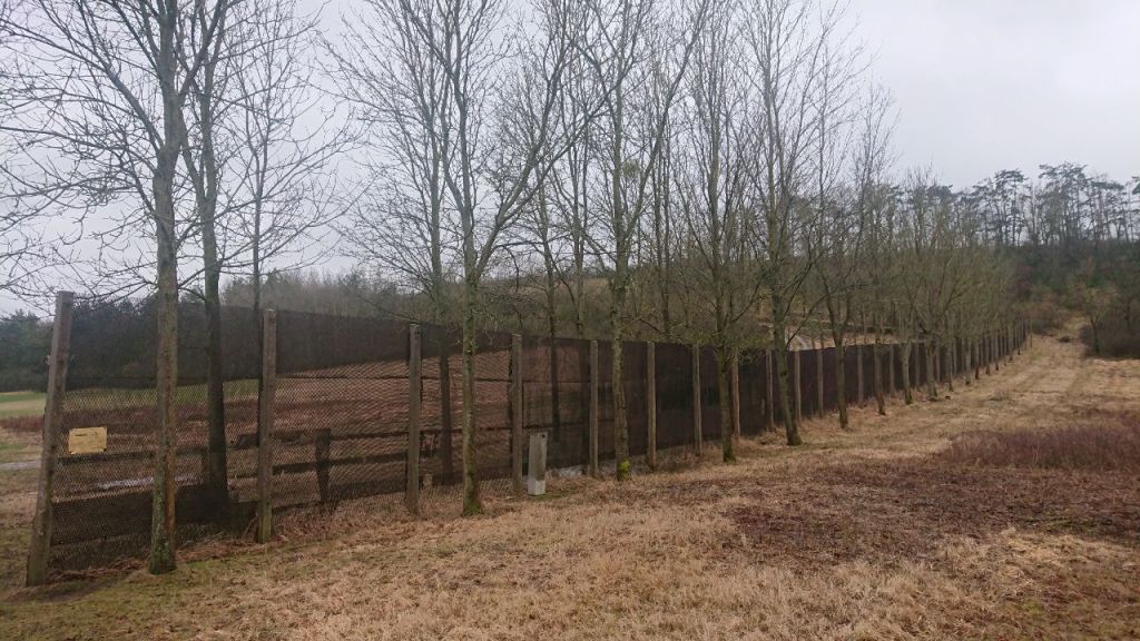 Kurz vor der Grabespyramide, mache ich einen 1,5 km Abstecher zum Baumkreuz. In der Ferne sehe ich einen Schimmel und zwei Braune mit Reitern, die weiter Richtung Lüderbach reiten. Ich schreibe das, weil ich heute quasi niemand auf dem Weg treffe. Das Baumkreuz ist eine Anpflanzung von Eschen und Linden in Kreuzform, da wo die B7 auf die alte innerdeutsche Grenze trifft. Es ist noch ein langer Abschnitt des damaligen Grenzzauns erhalten. Hier überquere ich die nicht mehr existierende Grenze ein viertes Mal, um gleich wieder zurückzukommen.