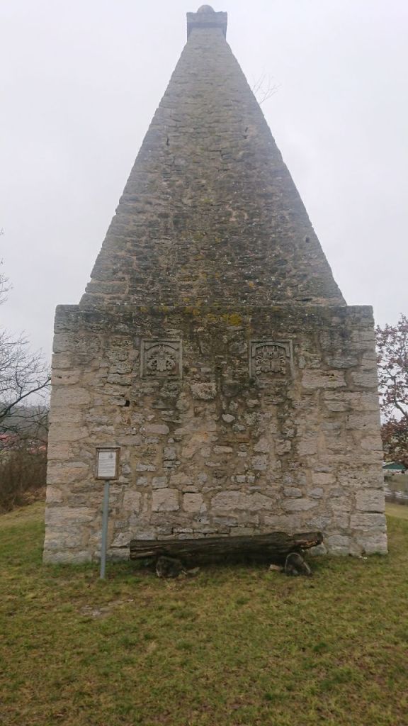 Von hier mache ich noch einen Abstecher hoch zur Grabpyramide, wo der letzte Schlossherr von Lüderbach, Herr von Castellan, der keine Nachkommen hatte, mit seiner Schwester begraben ist.