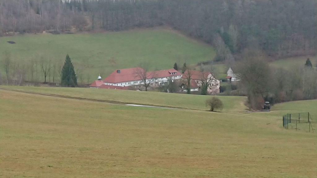 Aus Spichra heraus geht es auf besagtem Radweg schnurgerade. Wie ich auf der App sehe, hätte es vorher eine Möglichkeit gegeben, über einen niedrigen Höhenrücken durch den Wald auf einem Wanderweg abzukürzen, was ich natürlich verpasst habe. Ich verfluche völlig sinnbefreit die Wegmacher. Sie hatten sicher ihre Gründe, es ist mein Fehler, ich hätte mich vorher informieren müssen. Links vor mir grasen Wasserbüffel und Gallowayrinder in den überschwemmten Auen. Es handelt sich um das Stiftsgut Wilhelmsglücksbrunnen, wo heute eine Käsemanufaktur betrieben wird. Hier geht es runter vom Asphalt auf einen eingeweichten Weg zwischen den Wiesen. In der Ferne sieht man linker Hand schon mein Etappenziel, die Creuzburg.