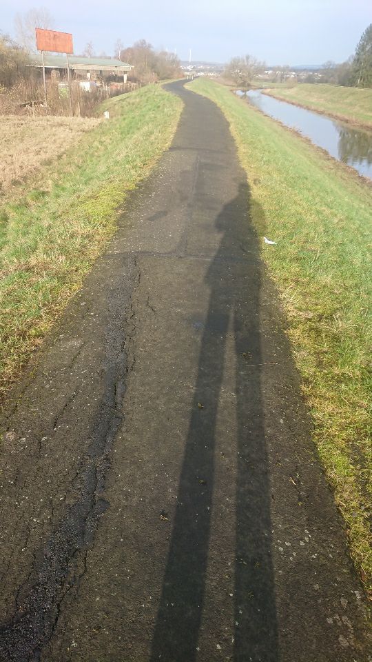 Um halb zehn bin ich endlich on the road. Draußen scheint die Sonne und es herrschen zweistellige Temperaturen. Obwohl ich das dünnere Hemd und das nicht ganz so warme Damart-Unterhemd anhabe, ist mir etwas warm. Ich gehe über einen Wiesenweg nach Stedtfeld rein.