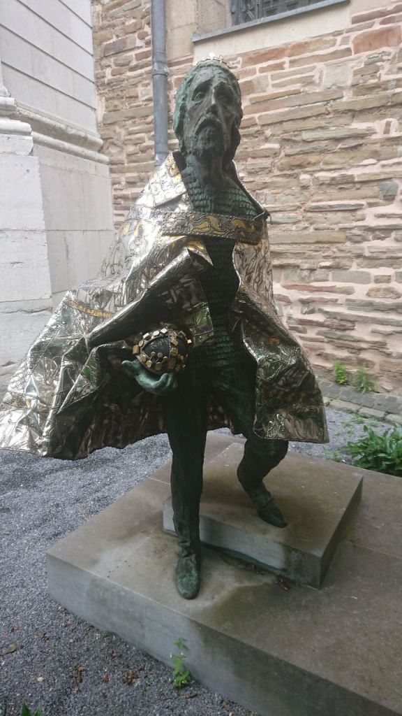 Das Törchen zum „Domgarten“ ist nicht verschlossen, im Schatten der Bäume steht eine Skulptur eines etwas gequält dreinblickenden Karls des Großen mit einem güldenen Mantel.