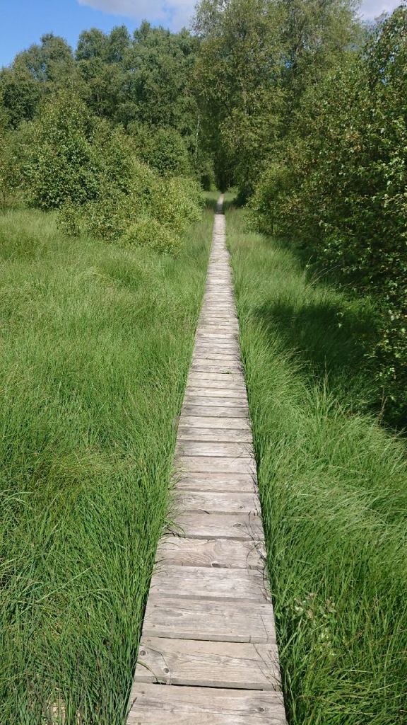 Dann biegen wir nach rechts ab auf einen schmalen Holzsteg, der uns etwa genau so weit über das Moor des Hohen Venns führt. Es regnet hier viel, der Boden lässt relativ wenig Wasser durch, die Verdunstung ist wegen des kühlen Klimas gering und es gibt wenig Abflüsse. Links und rechts des Stegs sind viele Heidelbeersträucher, die Beeren sind jedoch noch recht säuerlich.