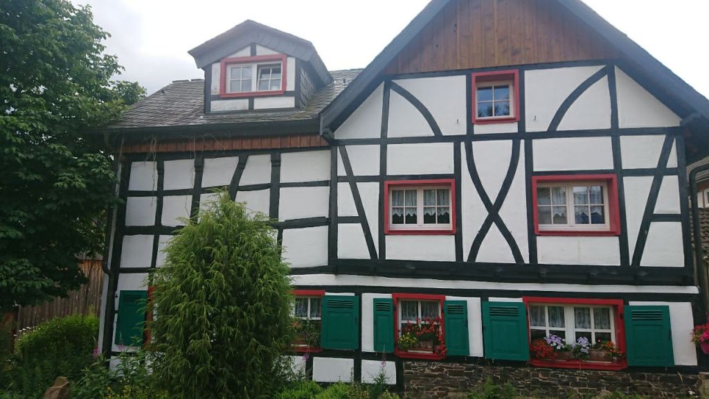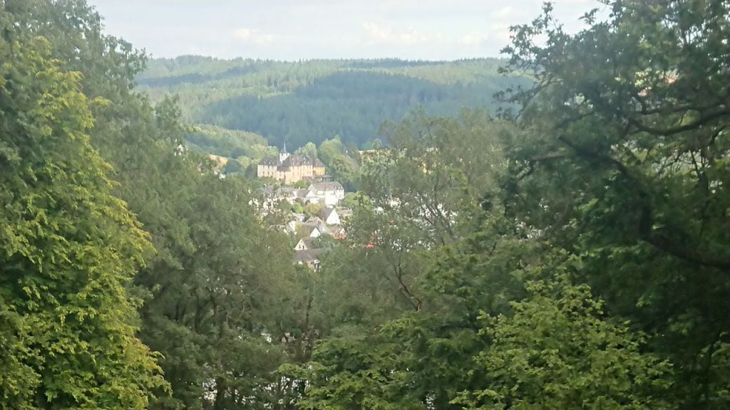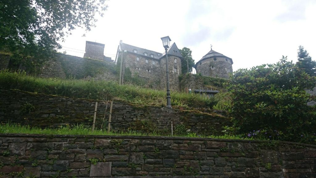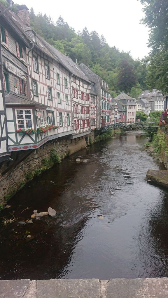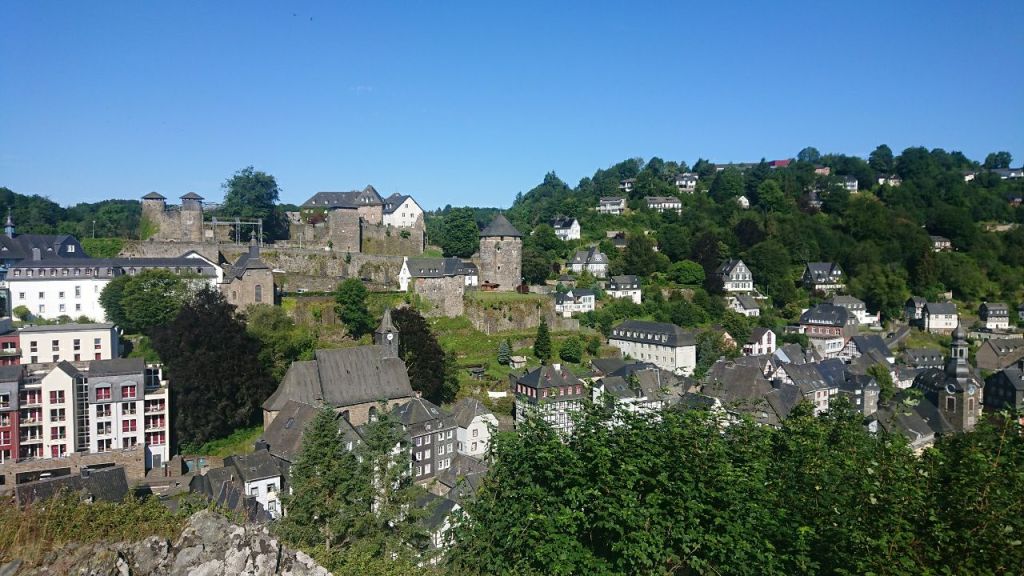 Auf einem angenehmen, nicht zu stark abfallenden Weg gehen wir auf Kiefernadeln hinunter nach Monschau, „der Perle der Eifel“, was sich anscheinend rumgesprochen hat. Der kleine Fachwerkort im schluchtartigen Rurtal platzt aus allen Nähten vor Touristen, die hier den sonnigen Sommersonntag genießen wollen.