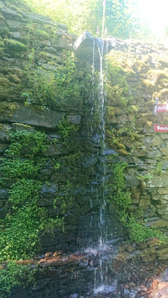 In Bruch setzen wir uns auf eine erhöhte Baumelbank im Schatten, wo man die Beine baumeln lassen kann, erfrischen uns innerlich mit kühlen Getränken aus dem Automaten und äußerlich durch eine kurze Kneipprunde in der steinigen Salm, die gar nicht so kalt ist wie erwartet.