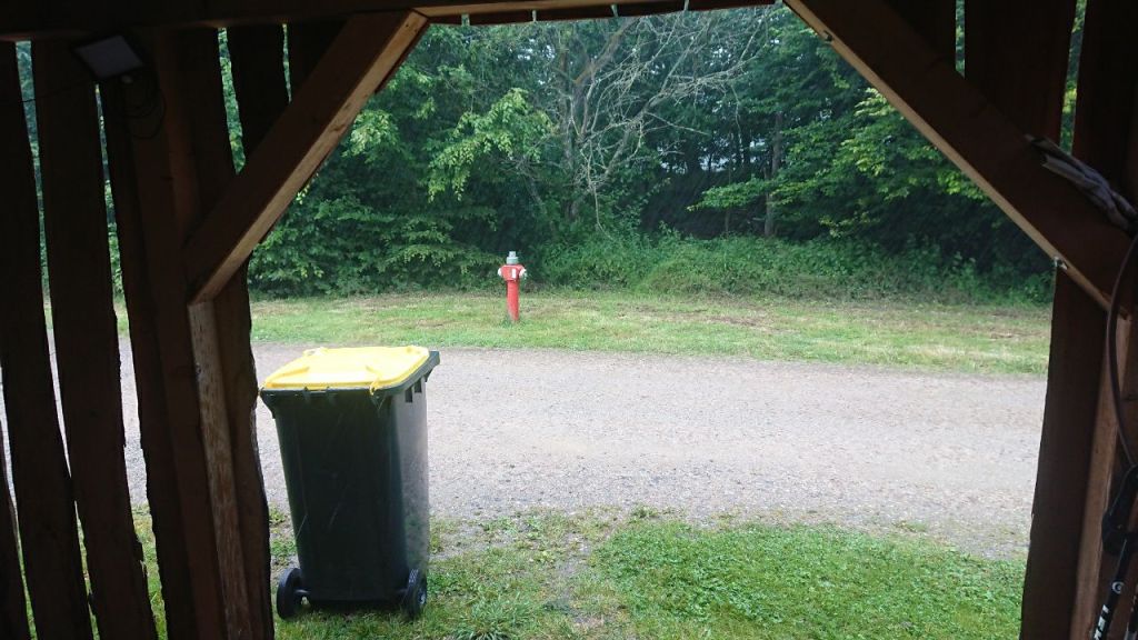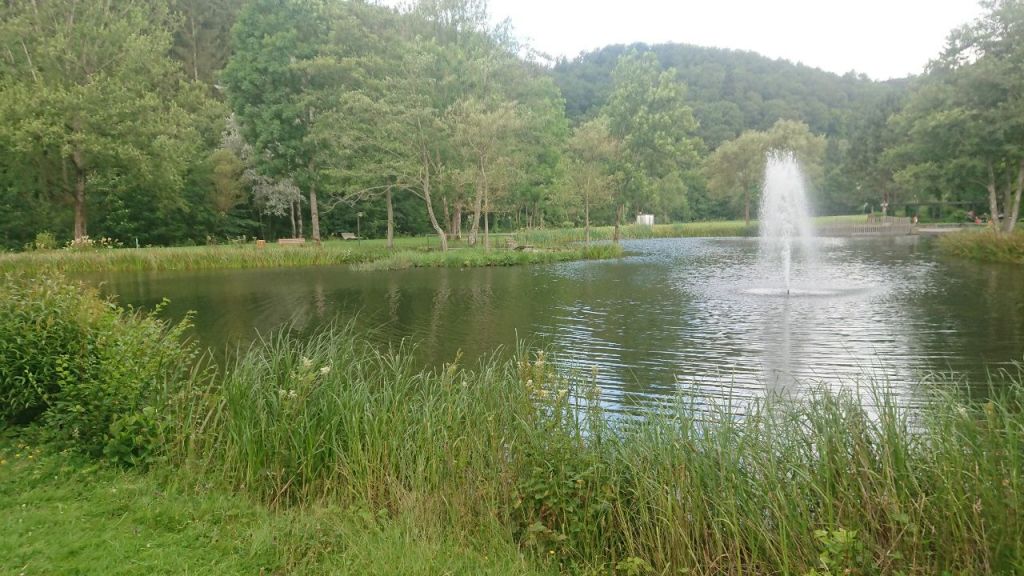Es geht nun einige Kilometer meist bergab bis wir schließlich zu dem Teich eines Angelvereins kommen, wo wir eine Mutter und Tochter mit Rucksäcken, die wir schon vorher am Dronketurm getroffen hatten, in der Sonne – ich denke noch „wie kann man nur?“ – rasten sehen, wahrscheinlich um zu trocknen. Der nächste Regenguss steht kurz bevor. Wir steigen ins Tal der Lieser hinab, wo zwar die Udersdörfer Mühle final geschlossen ist (Führer veraltet), dafür aber wenige hundert Meter weiter die Pension Haus Liesertal (als Einkehr nicht im Führer) Getränke und Snacks in einem Häuschen anbietet, wo man sich selbst bedienen kann und Geld in einen auf dem Tisch befestigten Briefkasten einwerfen kann. Eine hochwillkommene Überraschung. Jetzt fängt es richtig an, zu schütten und wir sitzen im Trockenen.