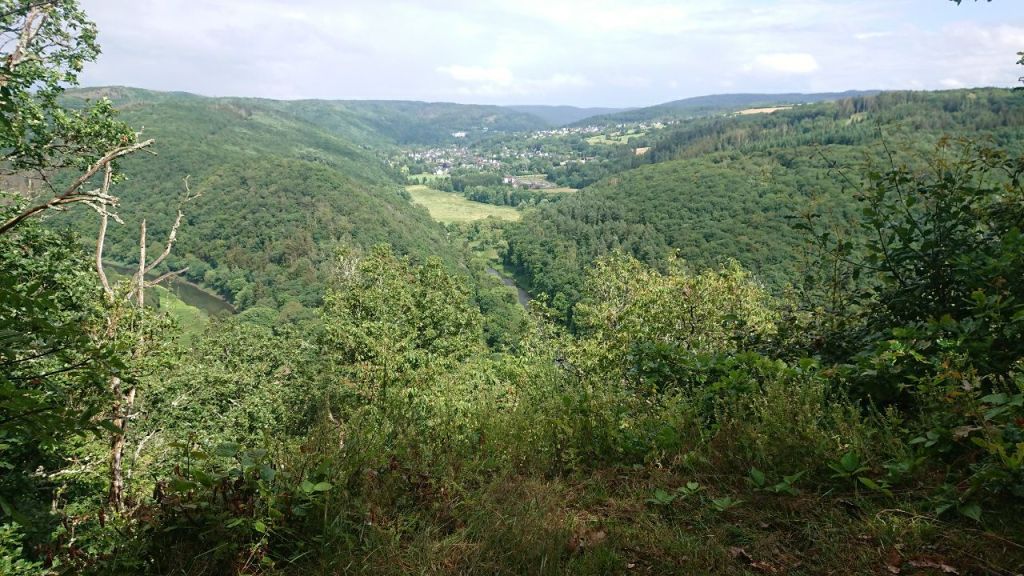Unsere Mittagspause machen wir 300 m abseits des Eifelsteigs in der Schutzhütte am Burgberg. Hier wurde ein Aluminium-Ponton gebaut, so dass man über die Baumwipfel hinaus auf die unten mäandernde Lieser blicken kann. Rechts ist nur ein schmales Stück erkennbar. Wir genießen hier zu zweit den Wurstsalat mit zwei Brezeln, einer Apfeltasche und 0,5 Liter köstlichem Ayran und einem guten Schluck Wasser. Immer wieder erstaunlich, wie viel besser das Essen und Trinken draußen nach körperlicher Anstrengung mundet.