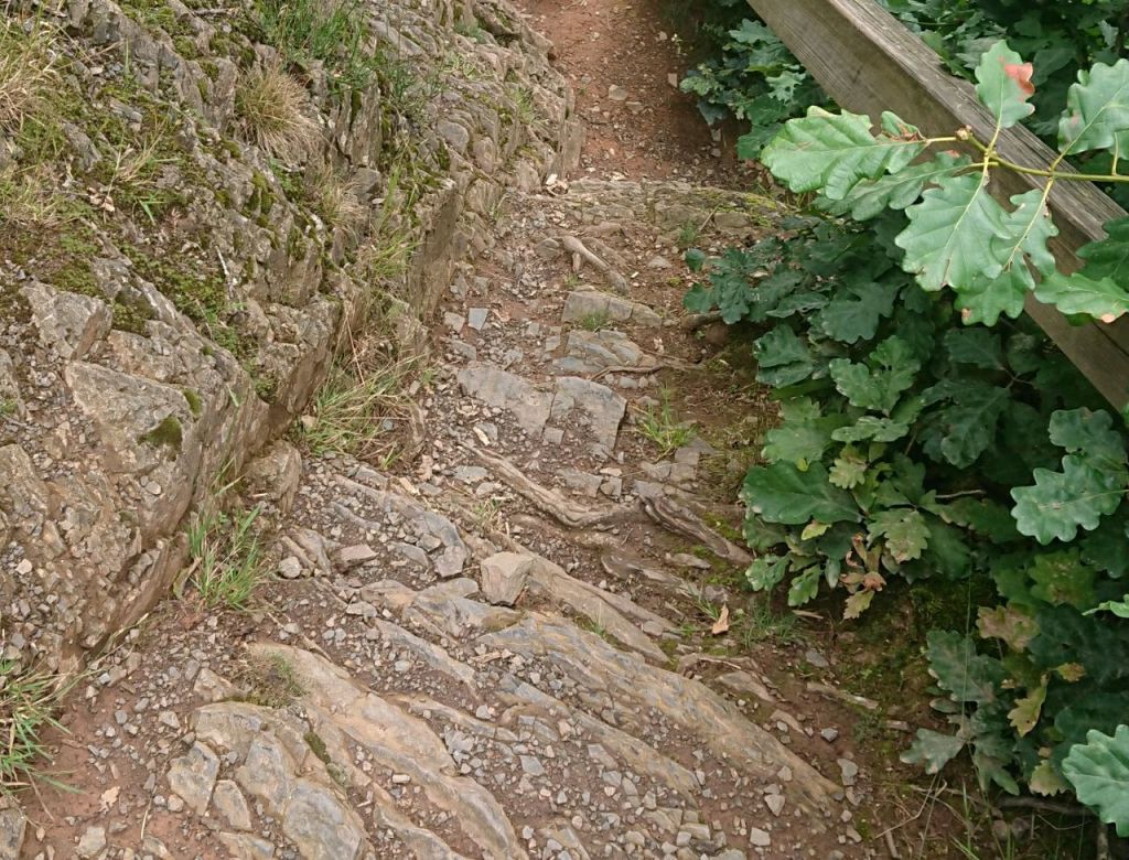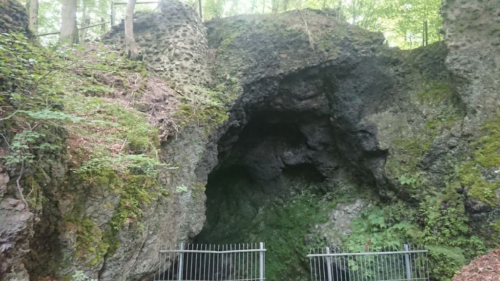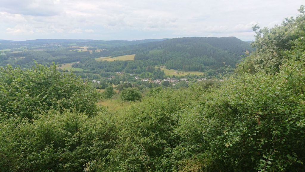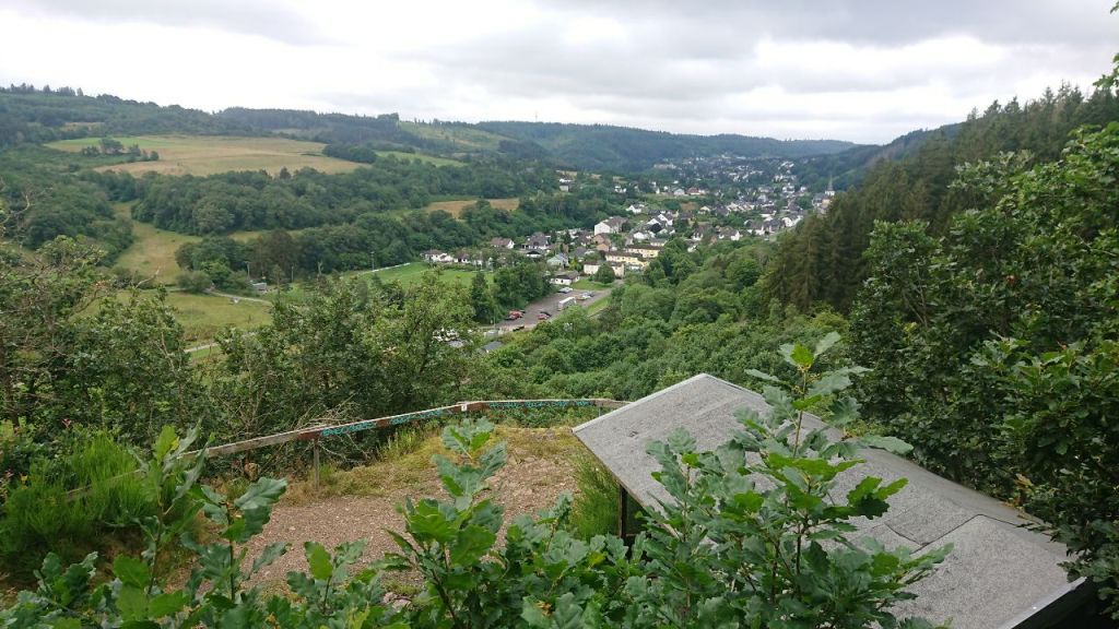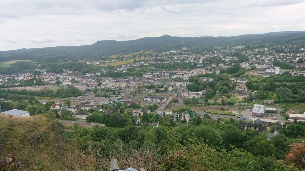 Aus Gerolstein heraus führen uns Stufen nach oben. Es geht los mit einem Anstieg, der uns zur Löwenburg mit Aussicht auf den Ort und die Dolomiten dahinter bringt. Hier treffen wir eine Holländerin, die sich mit ihrem Mann eine Wohnung auf 400 m Höhe gekauft hat, so dass sie vor zukünftigen Überschwemmungen – die Bahnlinie und die Uferstraße waren unter Wasser vor drei Jahren – sicher sind. Ihr Hund wurde gerade eingeschläfert, sie geht jetzt morgens allein spazieren.