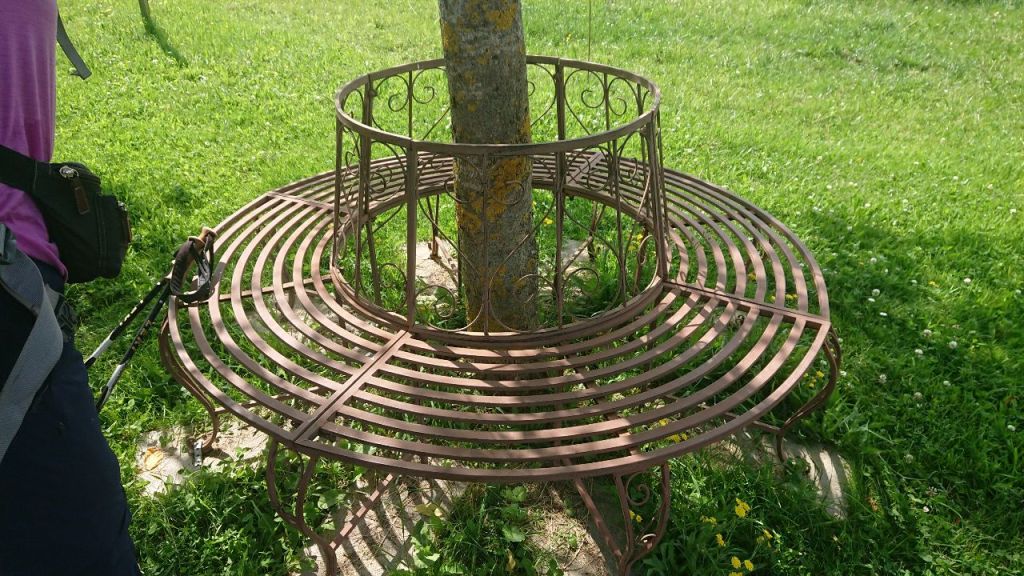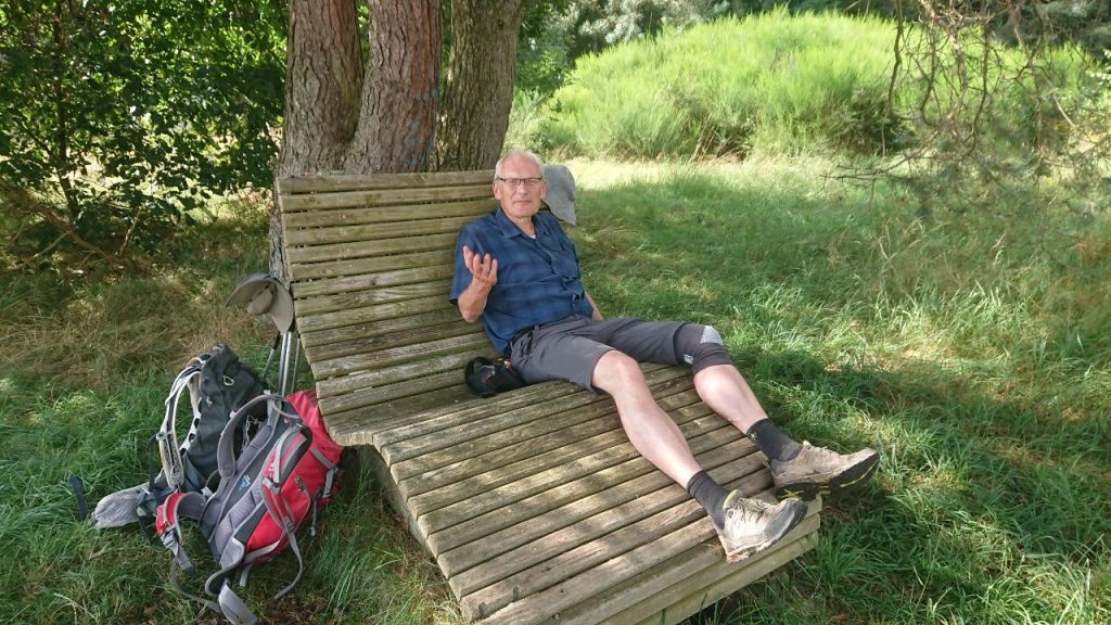 Die letzten Kilometer der Etappe bewegen wir uns unten auf Wiesenwegen bzw. auf der schmalen Straße. Am Wegesrand eine halbe Stunde vor dem Ziel noch eine Liegebank, der wir uns nicht entziehen können.