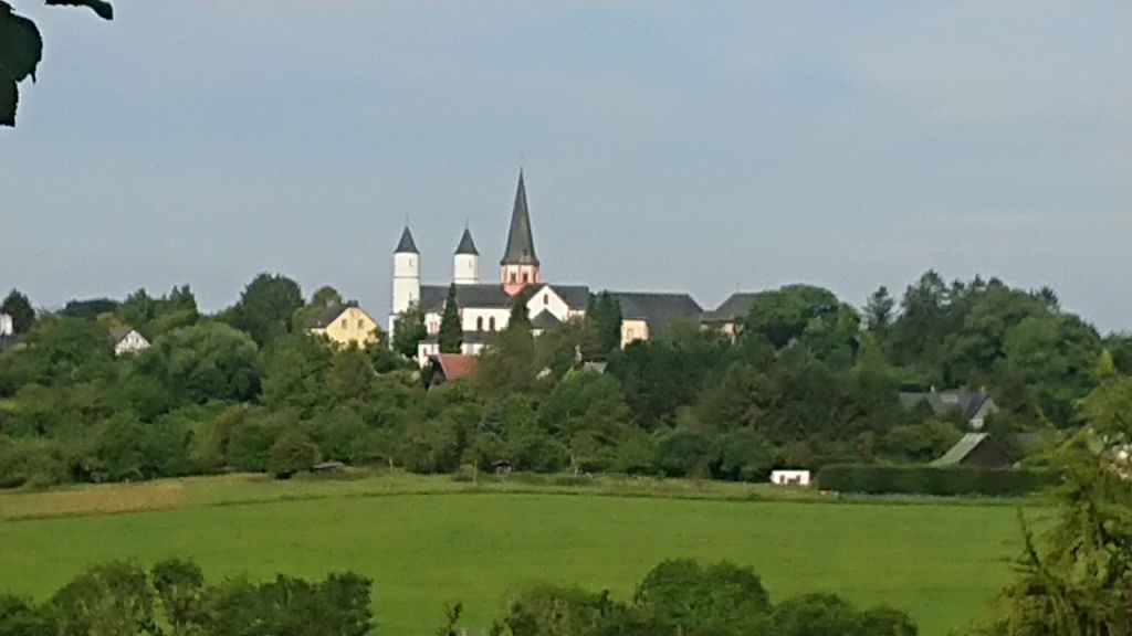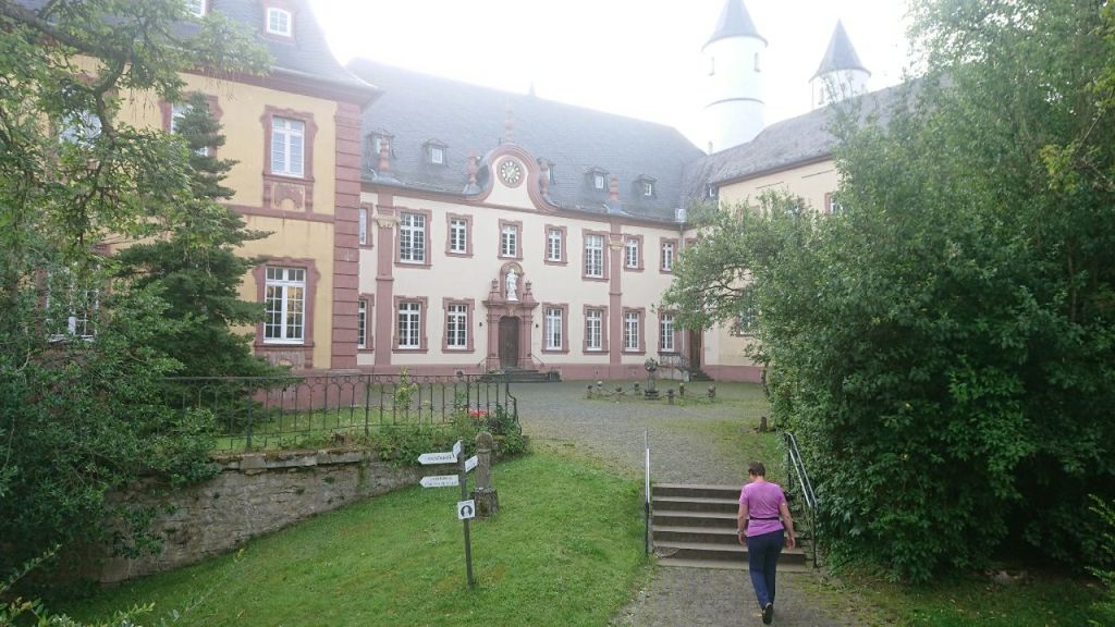 Wir essen ein Eis vom Klostershop und beziehen unser einfaches, aber zweckmäßig mit Schreibtisch eingerichtetes Zimmer inkl. Dusche und Bad und sputen uns mit der Körperpflege, da wir nur 30 Minuten Zeit haben, bis pünktlich um 18 Uhr das Abendbrot beginnt. Auch hier schmecken die einfachen Speisen ganz hervorragend, es gibt Kartoffel- und Krautsalat sowie sehr leckeres frisches Graubrot mit bissfester Krume aus der Klosterbäckerei. Wir lernen kurz den sympathisch-offenen Bruder Stephan kennen und gucken uns anschließend noch auf dem weiträumigen Anwesen um. Dabei treffen wir die junge Wanderin wieder, die im direkt hinter der Klostermauer liegenden Gasthaus untergekommen ist. Wir reden übers Wandern, sie macht ihre erste Tour alleine, um reinzuschnuppern, ist in Daun gestartet und geht auch bis Trier.