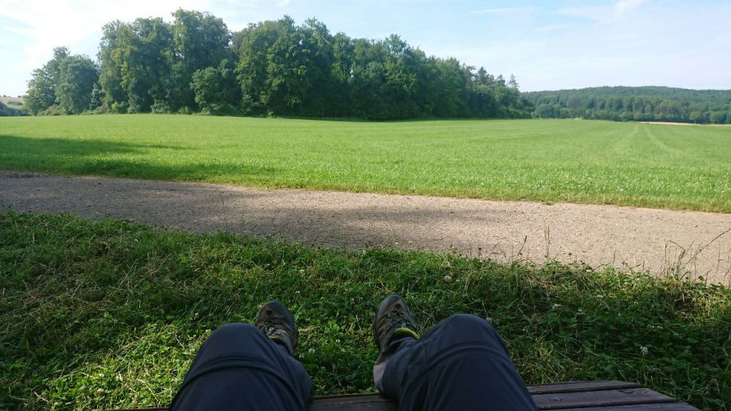 Wir sind mal wieder in unserem Trott, da steht rechts unterhalb des Weges mit Blick auf eine Wiese eine Wohlfühlbank. Wir chillen kurz, ich vergewissere mich, dass unser Zimmer bis 19 h reserviert ist und es geht weiter. Das Schönste am Wandern ist das Innehalten, sind die Pausen.