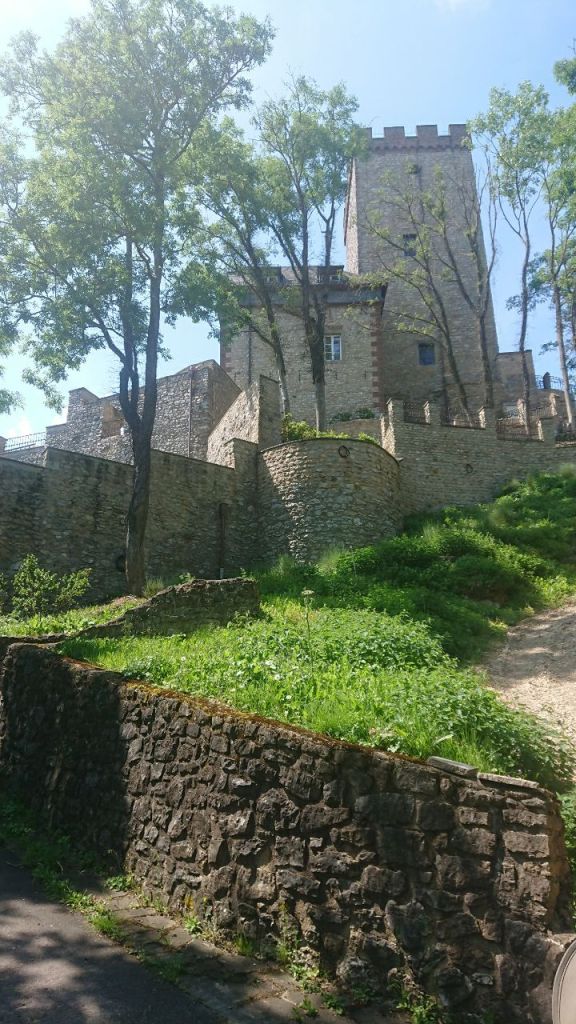 Wir haben jetzt nur noch einen kurzen Aufstieg vor uns und schleppen uns mit den letzten Kräften zu unserem Hotel, wo wir bald ein Menü mit Melone und Schinken, Schnitzel mit Pommes und Salat, sowie einen sahnigen Käsekuchen zu uns nehmen dürfen. Bei der anschließenden Besichtigung der in Familienhand befindlichen Burgruine lassen wir uns noch fast aussperren, aber am Ende kommen wir wohlbehalten in unsere Kojen.