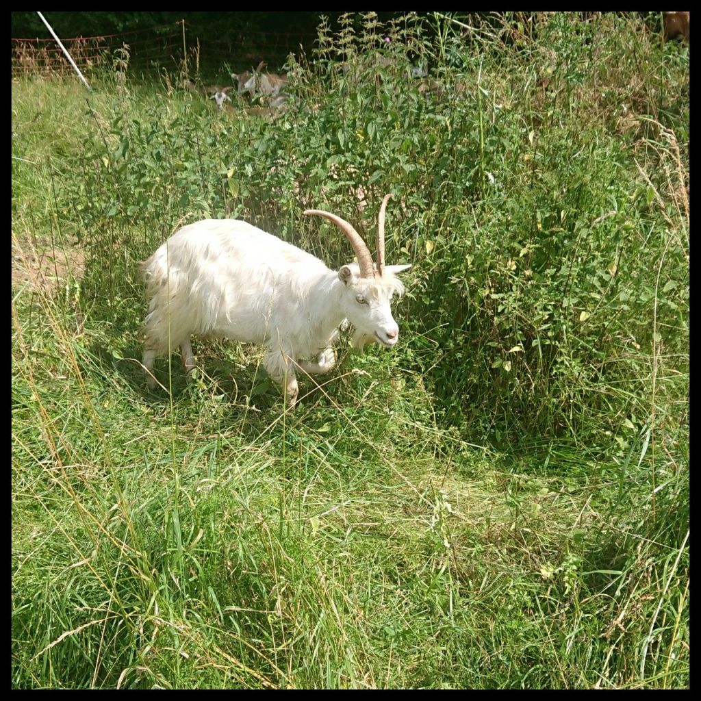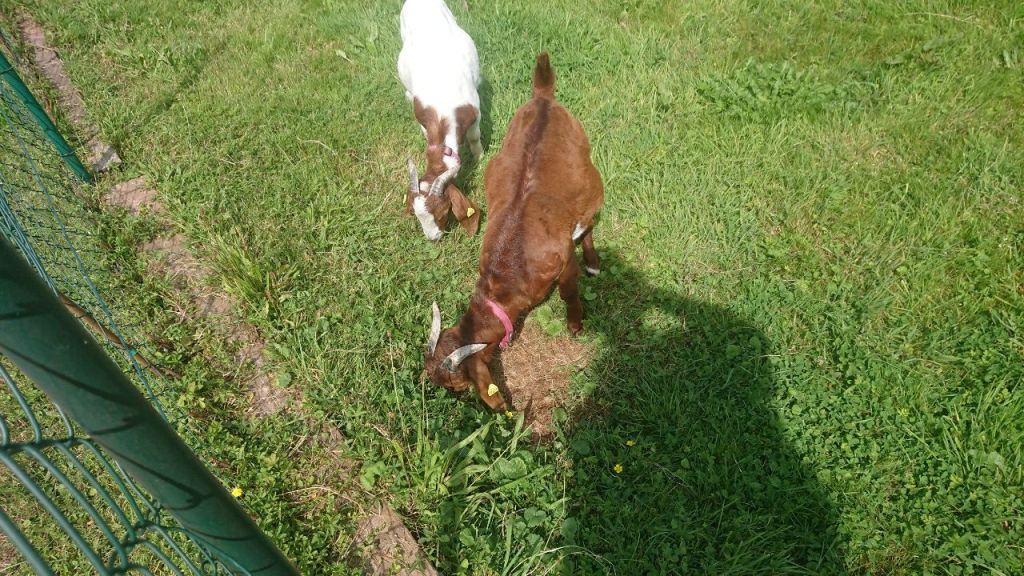 Auf dem Weg einige schwarze Mistkäfer, teils unterwegs in Richtung Trier, teils in Richtung Aachen. Kurz vor unserem Ziel kommen wir an einer, kleinen abgezäunten Wiese vorbei, wo zwei zutrauliche Ziegen grasen.