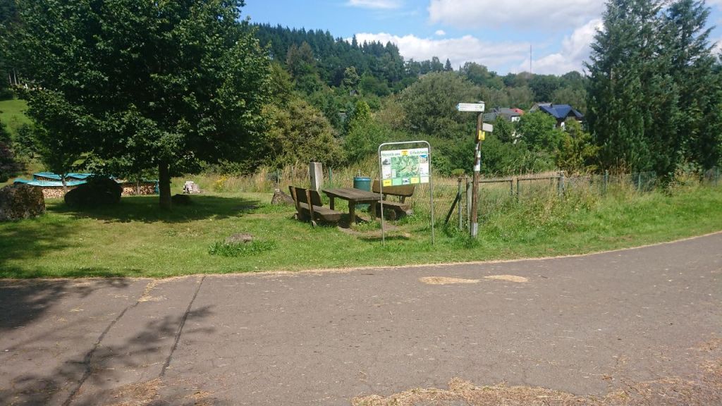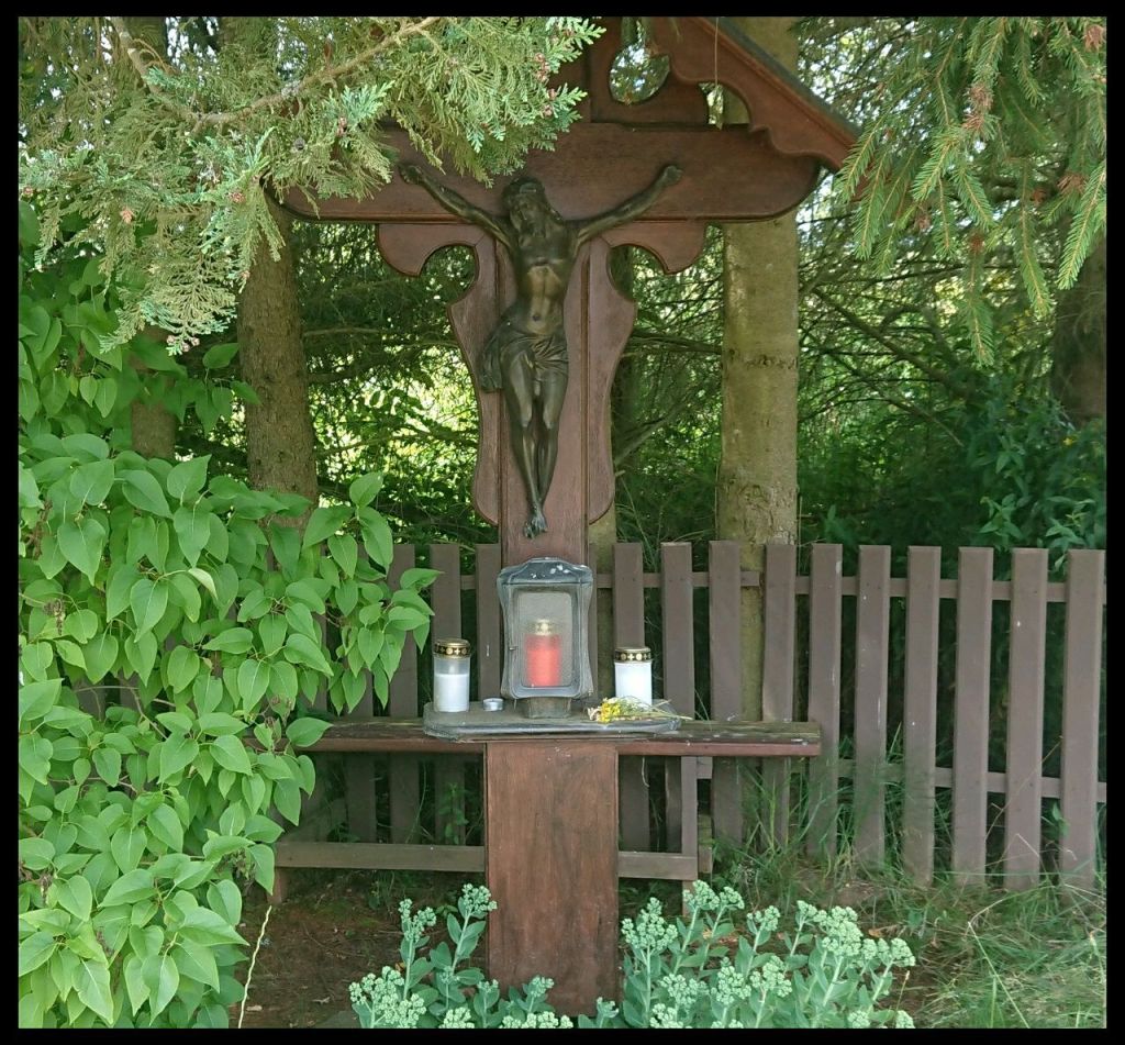 Wir kommen flott voran auf der breiten Piste. Kurz vor Neroth endlich eine Bank. Welche Enttäuschung, dass sie in der Sonne liegt und, dass der Jesus am Kreuz daneben im schönsten Schatten hängen darf. Die Prioritäten sind hier klar gesetzt.