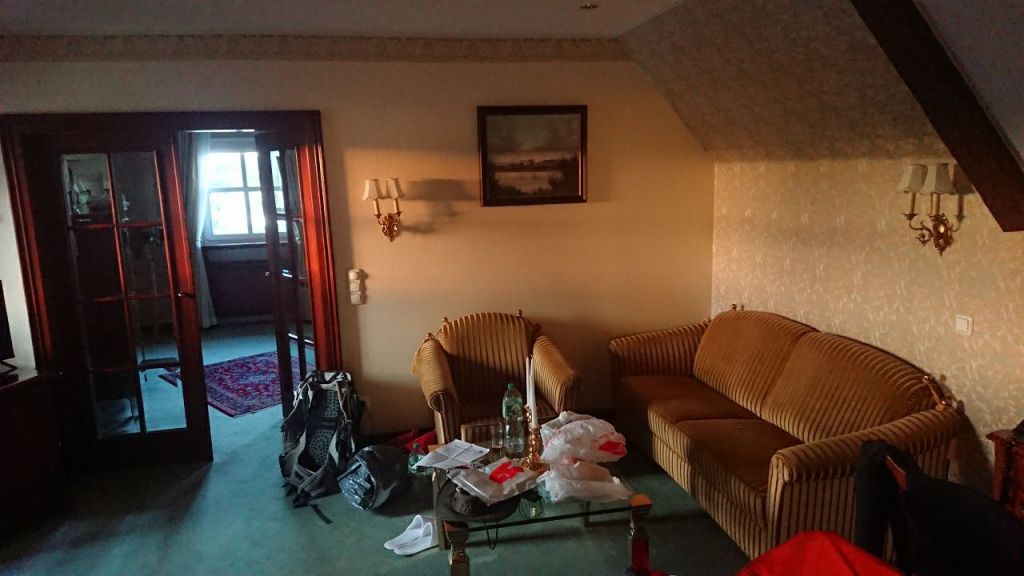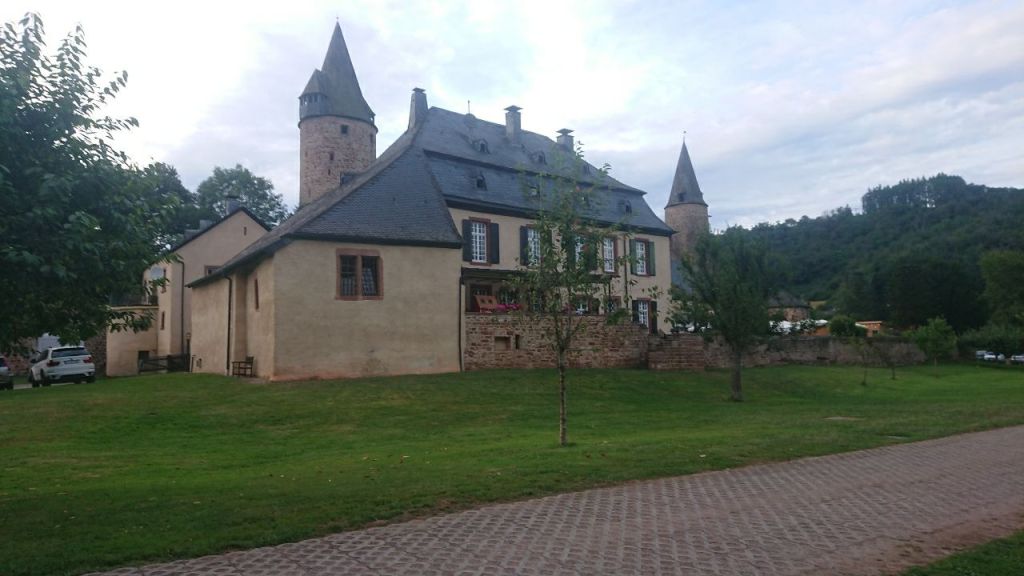 Ich werde nach einer erholsamen Nacht in dem etwas zu kurzen Bett im Hotel Burg Ramstein von prasselndem Regen geweckt. Nach dem Verfassen des Tagebucheintrags vom Vortag entscheiden wir uns noch vor dem Frühstück angesichts des Regenradars, der für den ganzen Tag Niederschlag für die Region prognostiziert, die letzte Wanderetappe – von gerade mal rund 15 km – buchstäblich ins Wasser fallen zu lassen.