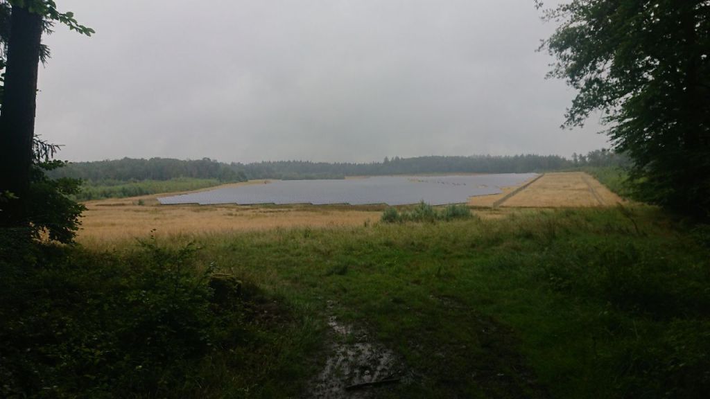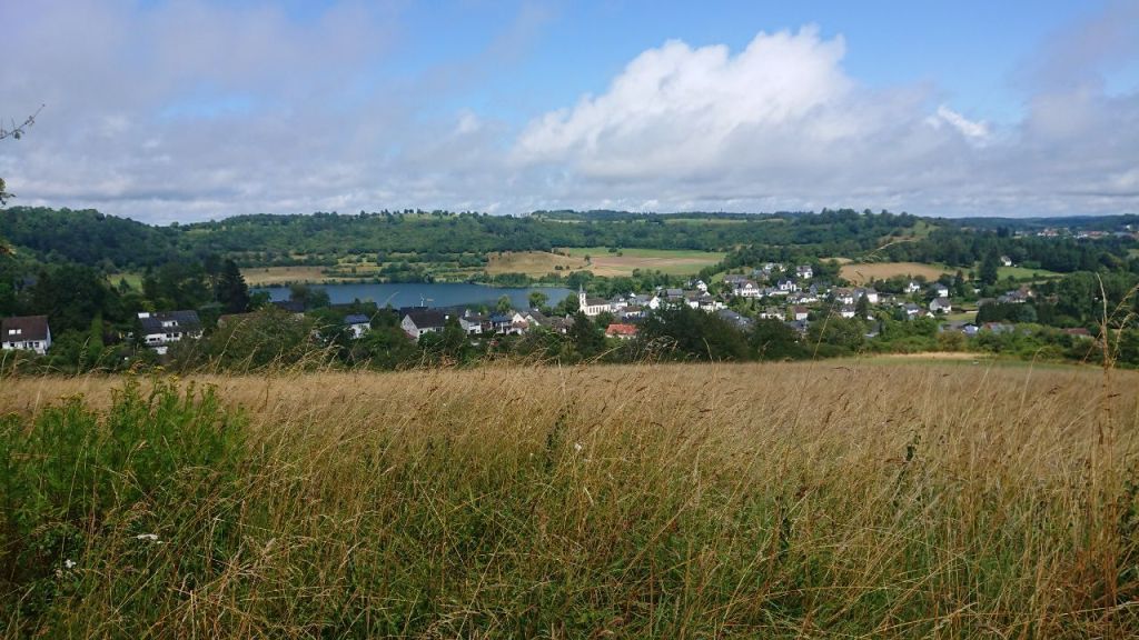 Wir setzen den Weg fort und gehen fast komplett um das Weinfelder Maar herum. Inzwischen fängt es an, etwas zu tröpfeln, ich ziehe die Regenklamotten an, was wie so oft dazu führt, dass ich statt durch das bisschen kühlen, erfrischenden Regen durch meinen eigenen klebrigen Schweiß von innen nass werde. Den Teufel mit dem Beelzebub ausgetrieben…
