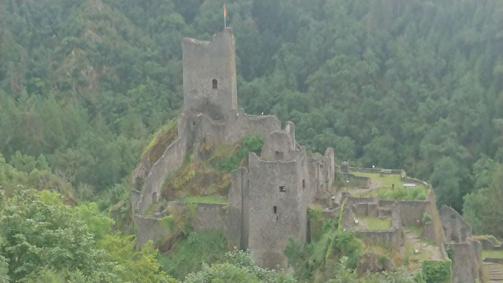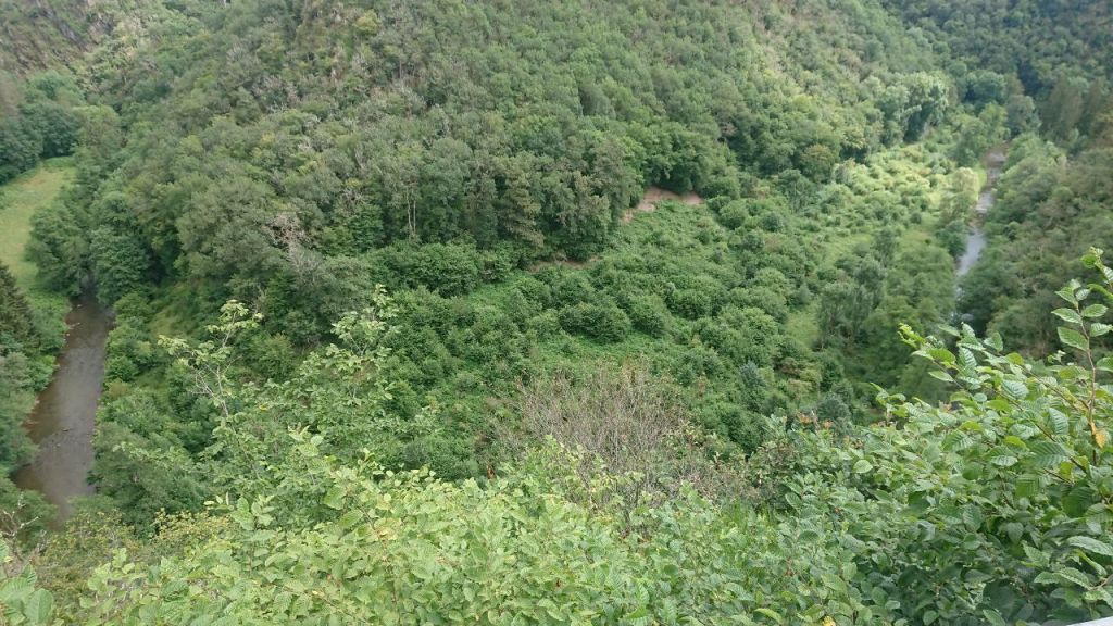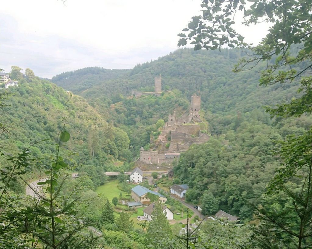 In der Ferne sieht man schon die Oberburg von Manderscheid, die von den Erzbischöfen von Trier gebaut wurde, während die dahinter liegende Unterburg auf der anderen Bachseite luxemburgisch war.