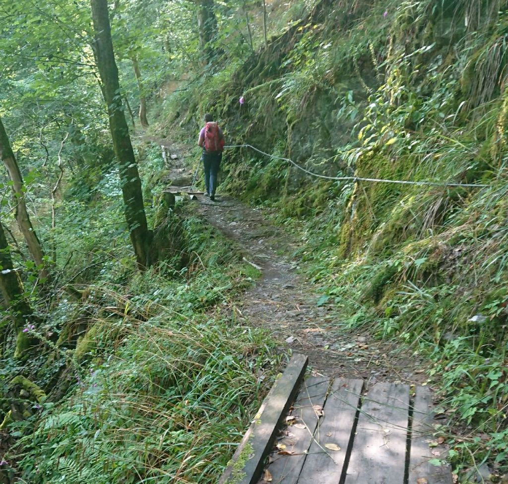 Auf dem Weg, der einige Kilometer hier oben verläuft, muss man sich etwas konzentrieren, ein falscher Schritt zu weit nach links kann katastrophale Konsequenzen haben. Irgendwann geht es dann durch den Wald hinunter zur Lieser über eine Brücke. Unten ist der Weg oft ziemlich matschig, ich tauche mit meinen flachen Wanderschuhen tief ein, ohne ganz stecken zu bleiben. Es geht sogleich wieder steil bergauf – den ganzen Tag ein kräftezehrendes permanentes Auf und Ab – zu einem Aussichtspunkt mit Sicht auf einen kleinen, runden Wiesenzipfel im Wald. Hier steht die junge Wanderin, die dasselbe Tagesziel wie wir hat und bewundert den Blick und die Schönheit der Natur.