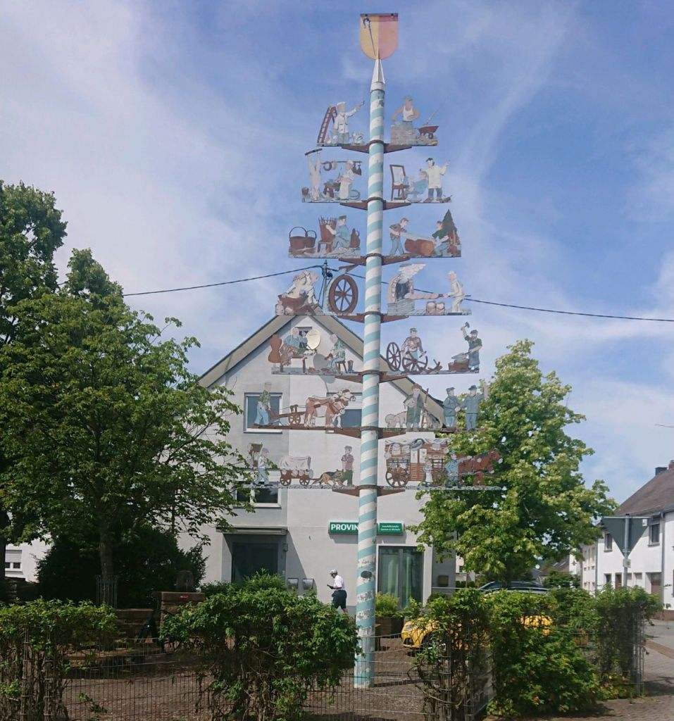 Vor Landscheid unterqueren wir die Autobahnbrücke der A60. Im Ort verlassen wir den Weg und halten unsere Mittagsrast mit Butterbroten im Schatten auf einer Mauer nahe der Kirche, Bänke gibt es keine. Etwas weiter im Ort liegt eine Bäckerei mit Café, wo wir uns einen Capuccino mit Zwetschgenkuchen genehmigen. Bald gesellen sich unsere holländischen Wanderfreunde hinzu, die ebenfalls eine Kaffeepause einlegen. Über uns fliegen mehrere Tiefflieger hintereinander eine scharfe Kurve und verursachen einen ohrenbetäubenden Lärm. Ein paar Kilometer westlich liegt Spangdahlem, eine US-Air Base, die Teil der weiter südlich in Ramstein stationierten 3rd Air Force sind. Ein idyllisches Eifelstädtchen stelle ich mir anders vor. Dafür gibt es hier einen Maibaum, obwohl Bayern weit weg ist.