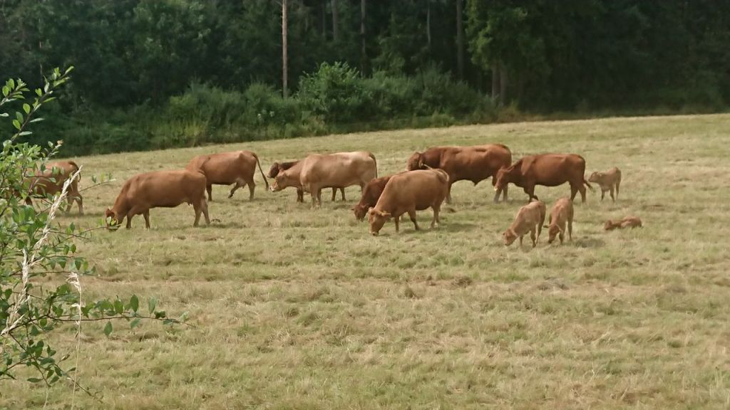 Nach dem Guss gehen wir den hochgelobten Lieserpfad an dem gleichnamigen Bach entlang Richtung Manderscheid. Anfangs an Weiden vorbei. Hier grasen die dunklen Büffel, die für den Mozzarella zuständig sind. Die Luftfeuchtigkeit ist hoch. Ich werde zunehmend von sehr anhänglichen Bremsen geplagt, die mich in die Arme bzw. Waden stechen. Bis ich dann später die biologische Variante des Anti-Brumm-Sprays zu Hilfe nehme. Dann ist Ruhe. Außerdem fällt mir ein anderer leicht nerviger Genosse auch auf dieser Wanderung auf. Der einzige Vogel, den man hier tagsüber außer gelegentlichen hohen Greifvögelschreien hört, ist der Gartenrotschwanz mit seinem an Einfallslosigkeit nicht zu überbietenden monotonen Gepfeife.