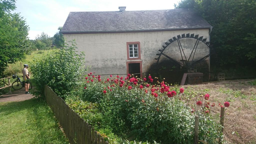 Heute haben wir eine der gemütlichsten Etappen des Eifelsteigs vor uns, es geht fast die ganze Zeit rund 20 km die Salm abwärts, Steigungen sind eher Ausnahmen. Sehr bald treffen wir ein jüngeres holländisches Paar, das auch in Himmerod übernachtet hat und gehen längere Zeit gemeinsam. Sie kommen aus Gouda zwischen Utrecht und Amsterdam, haben schon ältere, recht selbstständige Kinder und machen ihre erste Fernwanderung. Sonst fahren sie passioniert Rad. Ihr Fernziel Trier, das Nahziel die Burg Bruch, wo auch wir nächtigen werden. Wir kommen an einer Mühle vorbei, wo Eidechsen in der Sonne vor uns weghuschen. Irgendwann lassen wir die Holländer ziehen, da sie auch aufgrund der kleinen Rucksäcke schneller sind und wir eine Trinkpause machen.