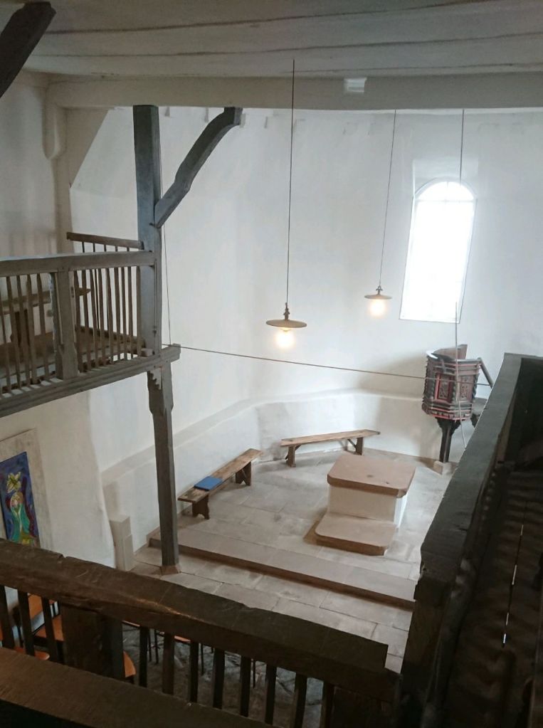 Draußen ist es feucht, es hat über Nacht geregnet. Kurz nach 9 verlassen wir die Unterkunft, Im Ort besichtigen wir die schmucke, restaurierte Fachwerkkirche, der Schlüssel ist in einem Körbchen am Eingang eines Nachbarhauses. In der Kirche ist es aufgrund der geweißelten Wände sehr hell, die holzgeschnitzte Kanzel ist von 1730. Über eine Seitentür gelangt man zur Empore.