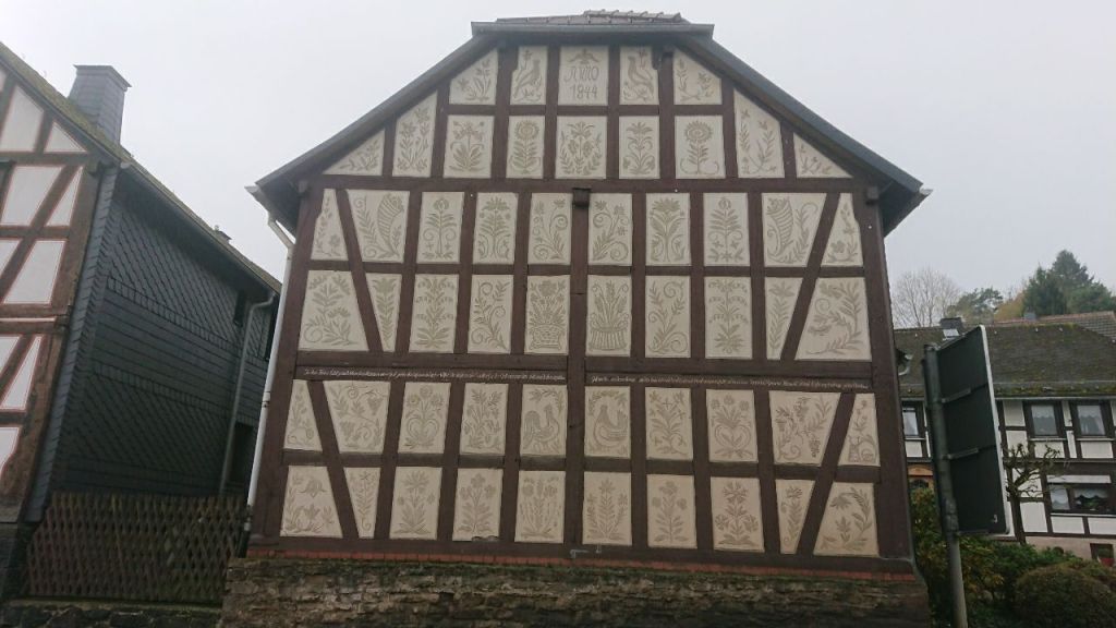 Im Ort kommen wir an einer eindrucksvollen Fachwerkhausfassade vorbei, hier wurde die Technik des hessischen Kratzputzes angewendet, die seit 2016 zum immateriellen Kulturerbe zählt und im Marburger Umland verbreitet ist.