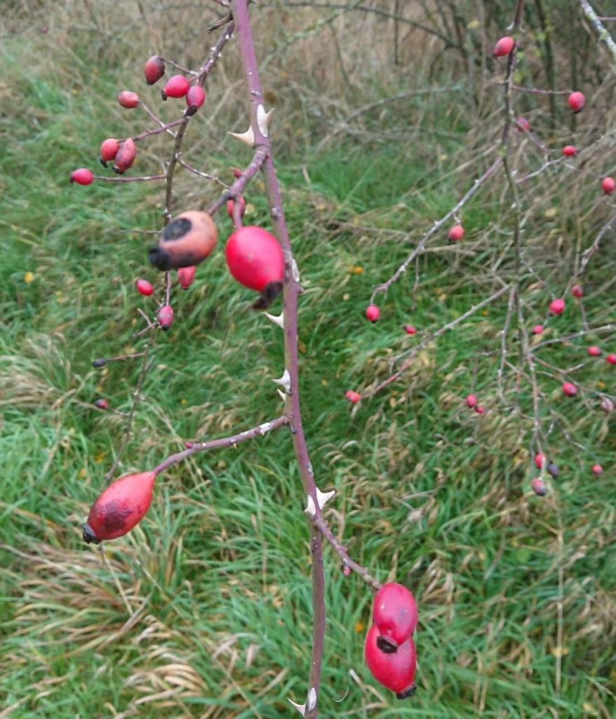 Es bleibt heute den ganzen Tag mehr oder weniger trocken, wir kommen durch Niederhörlen, das seine Fachwerkkirche dem Hessenpark Neu-Anspach gespendet hat. Ansonsten gibt es hier fast nur moderne Häuser. Über Oberhörlen kommen wir zum Galgenberg. Am Wegrand gelegentlich Hagebutten, bei dem trüben Wetter wäre ein Tee gar nicht schlecht. Auf einer Wohlfühlbank entspannen wir ein halbes Stündchen, das tut den geschundenen Füßen sehr gut.