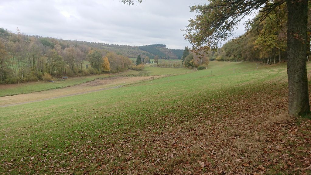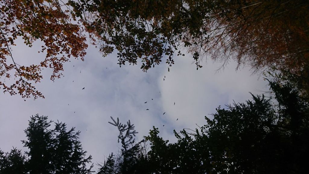 Es geht nun aufwärts zur Wallfahrtskapelle Eremitage, die wir links liegen lassen. Anschließend umrunden wir die äußerlich saubere und nicht stinkende riesige Mülldeponie halb. Über uns kreisen die Krähen. Wir lauschen dem Geräusch der heruntergefallenen gelbroten Blätter, die wir mit den Füßen aufwirbeln.