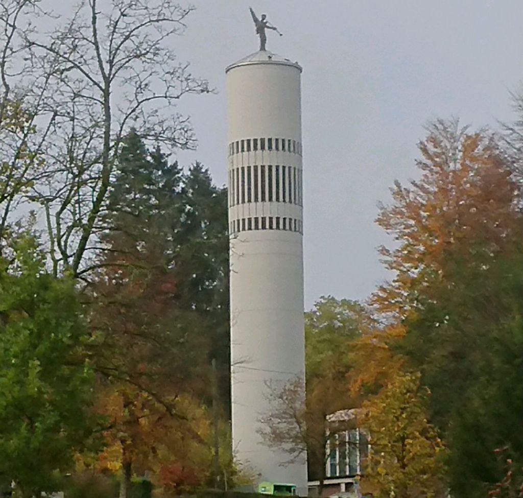 Oben auf dem modernen Turm der katholischen Kirche, der fast wie ein Bahaï-Tempel aussieht, ein Engel mit Trompete.