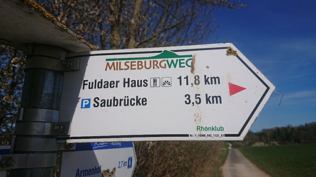 Ich gehe nun an einem hässlichen Betonklotz, der sich als Klinikum herausstellt, vorbei und spaziere durch Ziehers, einen Fuldaer Stadtteil. Es muss die A7 überquert werden und ich komme in eine ländlichere Umgebung. Nach einer Pause vor Keulos, erreiche ich über Wissels und Böckels endlich den Einstieg in den Milseburgweg, den richtigen Track habe ich inzwischen auch gefunden.