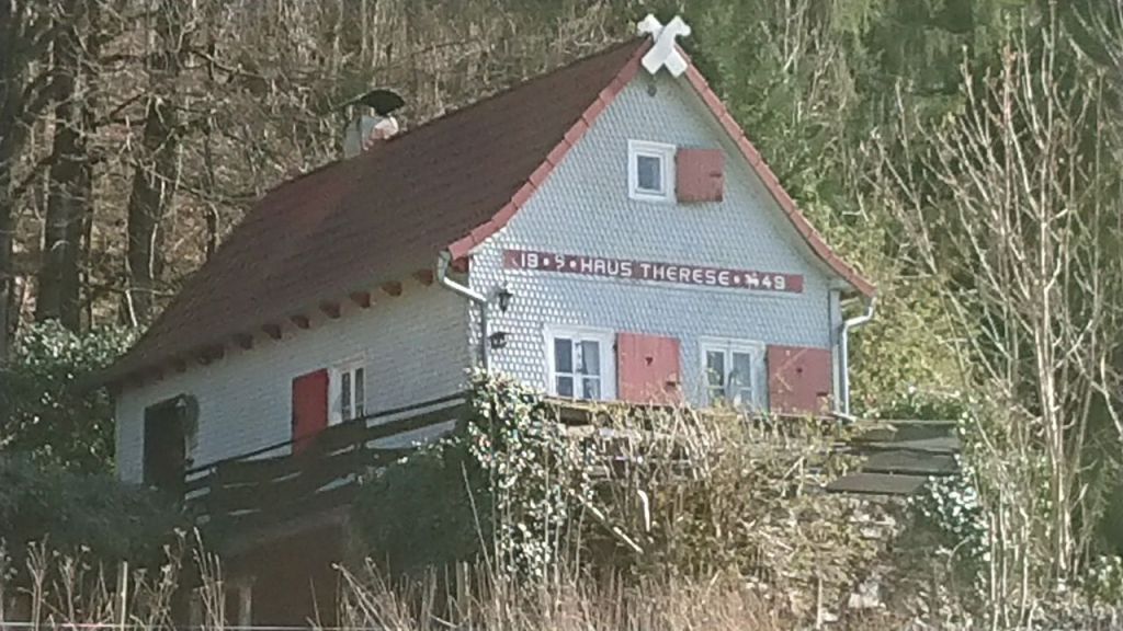 Vom Wegrand aus sieht man ein schmuckes Häuschen, das abenteuerlich über mir im Wald steht.