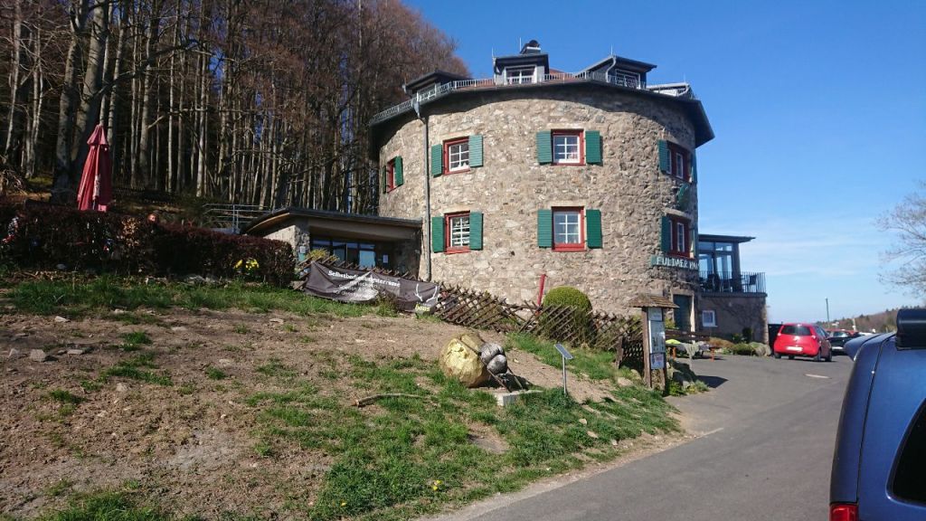 Schließlich komme ich gegen 17h bei meiner Unterkunft, dem Fuldaer Haus an der Maulkuppe an. Hier herrscht reges Wochenendtreiben. Auf diversen Terrassen kann man seinen Kaffee einnehmen. Ich verziehe mich in mein kleines Turmzimmer, mache mich frisch und esse früh um halb sechs im Gastraum, der sich langsam füllt. Besonders lecker ist der Nachtisch, ein Apfel-Krömbel mit Vanilleeis und Schlagsahne.