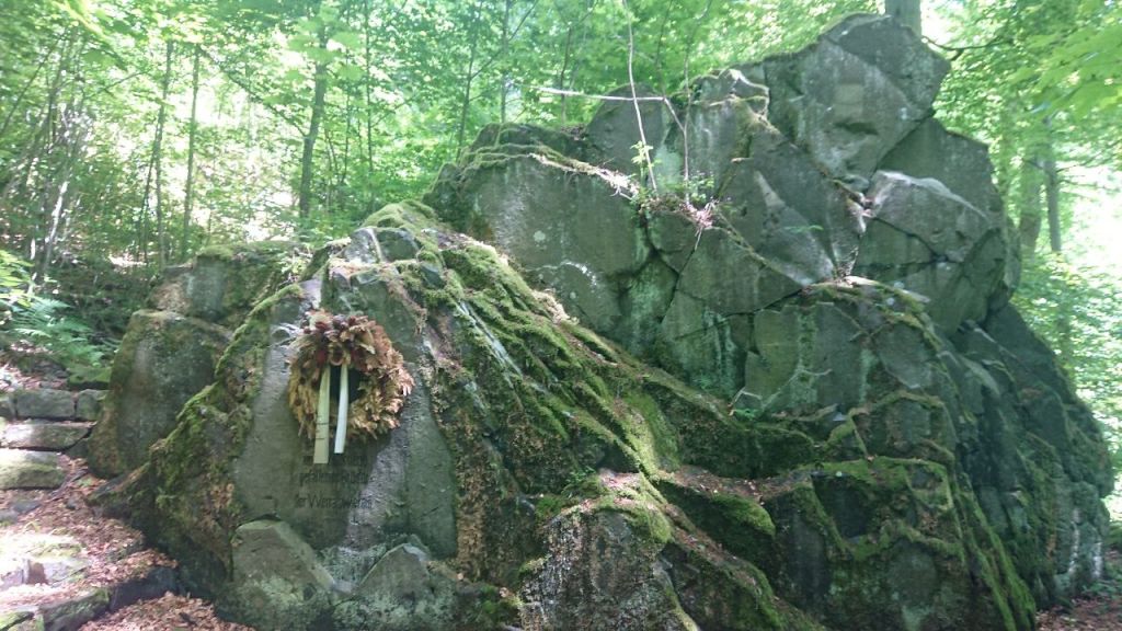 Oberhalb von Hausen ist dichter, feuchter Laubwald und wir gehen auf teilweise glitschigem Pfad erst einmal hoch zur Kitzkammer, einer Basaltspalte, die Eingang in die Märchenwelt gefunden hat. Hier soll Frau Holle die zeternden Mädchen, die von ihren Verlobten verlassen worden waren, in Katzen verwandelt haben, die dann den verirrten Wanderern den Weg weisen mussten, wobei die Bösen in die Irre geführt wurden.