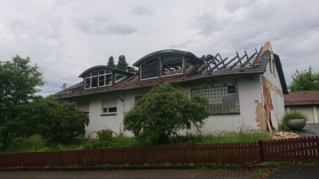 Der Regen lässt nun nach und wir gehen hinunter nach Wattenbach, wo wir vor vier Tagen losgegangen sind. Das ausgebrannte Haus haben wir beim Start am ersten Tag, wo wir hier schon einmal vorbeikamen, noch nicht gesehen. Die Brandstiftung fand bereits vor knapp 6 Jahren statt.