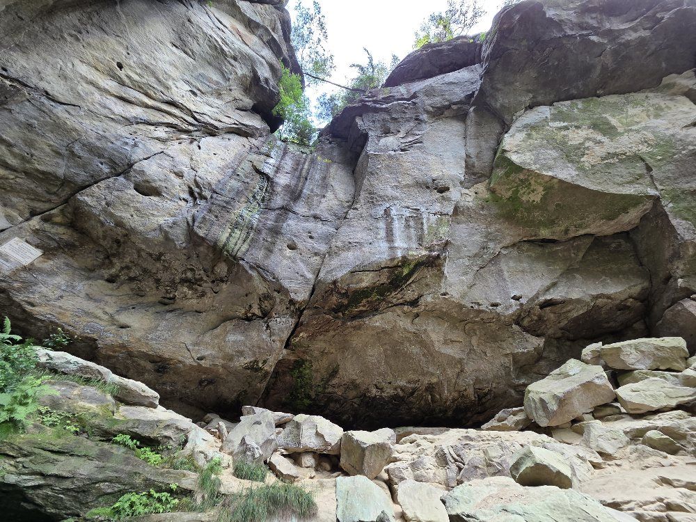 Auf dem Malerweg aus dem Ort hinaus überholen wir bald einen fotografierenden Wandergenossen. Wir werden heute immer wieder Wanderer treffen, die ebenfalls den Fernwanderweg gehen.Wir kommen zur Gautschgrotte, einem überhängenden Felsen. Hier in Hohnstein lebte der Ausnahmekletterer Bernd Arnold, nach dem eine Kletterschule und ein Outdoorladen benannt sind.
