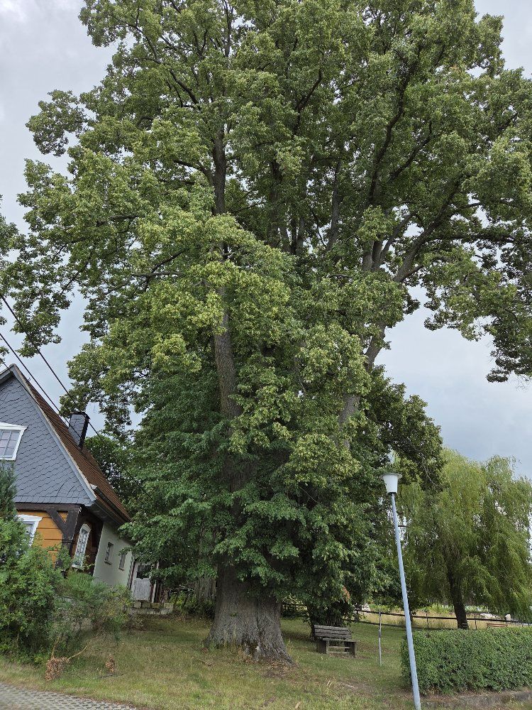 Im Ort kommen wir an einer eindrucksvollen Linde vorbei, der Stammumfang beträgt sicher an die vier Meter.