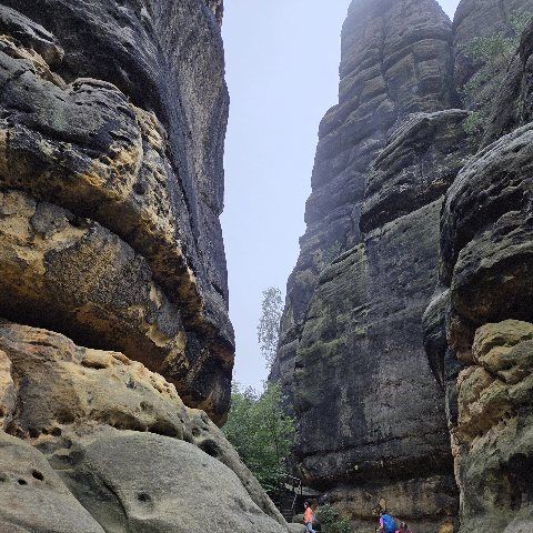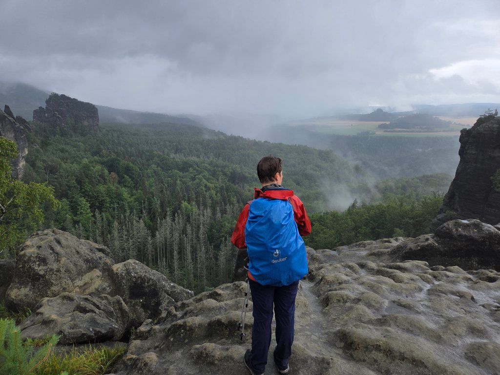 Als der Regen in Niesel übergeht, gehen wir weiter zur Breiten Kluft. Hier hat sich der Himmel bereits aufgeklart und C. vor mir erinnert mich etwas an ein bekanntes Bild von Caspar David Friedrich, das ja bekanntlich auch von der Sächsischen Schweiz inspiriert war.
