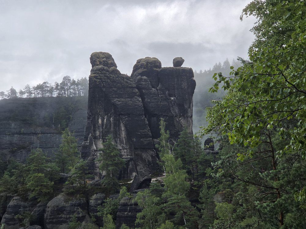 Nach dem Aufstieg sehen wir bald in der Ferne die markante Formation der Schrammsteine, die auf unserem Weg liegen.