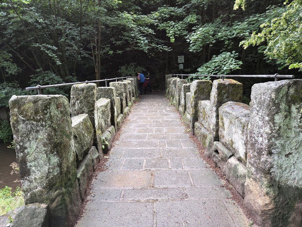 Von hier geht es über eine schöne Steinbrücke hinauf durch den Wald zu einer der Hauptattraktionen, dem von Caspar David Friedrich im Bild verewigten Kuhstall, der ca. 30 Minuten entfernt ist. Es kommen uns so einige Besucher entgegen.