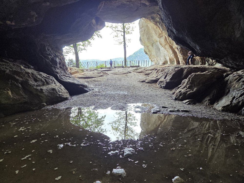 Den Kuhstall, eine offene Höhle unter einem Sandsteinfelsen, nehme ich klassisch von vorne gegen das Licht und von hinten auf. Von hinten hat er mehr Höhlencharakter.