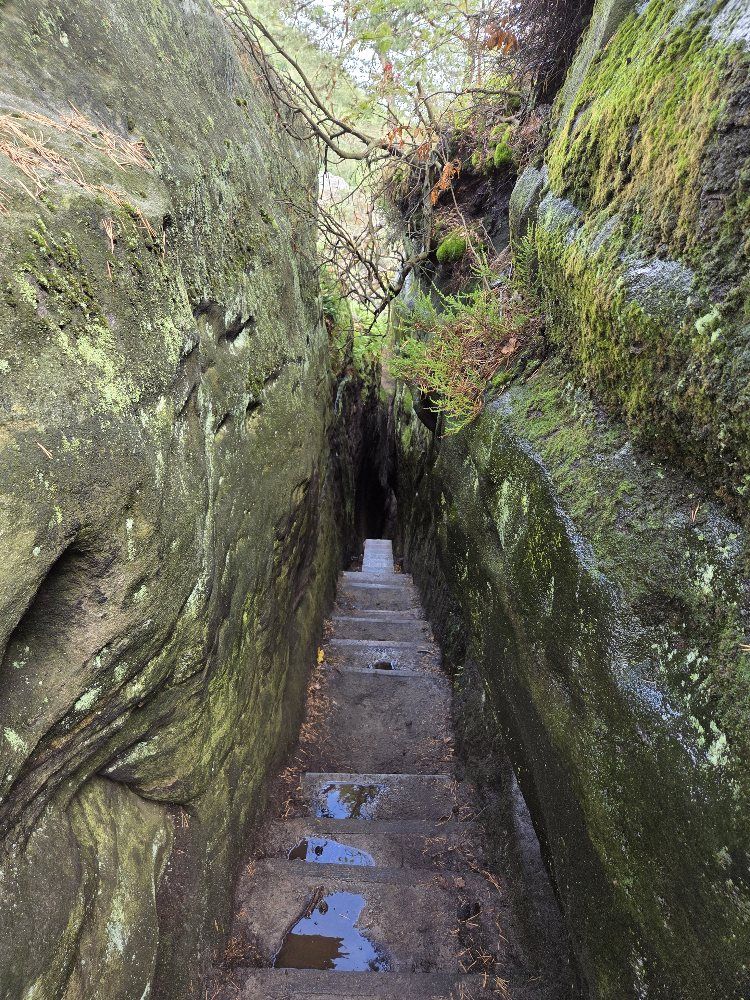 Hinterm Kuhstall führen superschmale, metallene Stufen durch den Fels hindurch nach oben, sozusagen auf das Dach des Kuhstalls. Wir kommen da so gerade eben mit unseren 30 Liter-Rucksäcken durch. Es handelt sich um die sogenannte Himmelsleiter. Von oben hat man eine gute Aussicht über diesen Teil der Sächsischen Schweiz. Hier ist auch viel weniger los als unten.