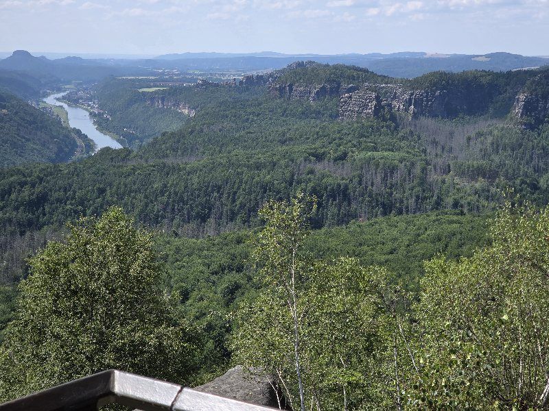 Es geht weiter auf Holzplanken über morastigen Boden hinauf zum Winterberg, wo wiederum eine Baude steht. Wir nehmen einen deliziösen Eiskaffee zu uns. Der nette Wirt fragt mich, woher wir kommen und gibt mir den Tipp mit dem Kipphorn. Diese relativ wenig frequentierte Aussicht, die etwa 400 Meter abseits des Weges liegt, kann man nicht anders als spektakulär bezeichnen. Links die Wälder und Berge der Böhmischen Schweiz, direkt vor uns die Elbe, die sich ihren Weg durchs Elbsandsteingebirge bahnt, am rechten Elbufer in der Ferne Bad Schandau, dann die Schrammsteine. Wir haben den Ausblick vorne an der Aussichtsbank ganz für uns allein und sind begeistert.