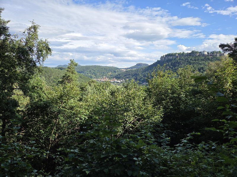 Wir wandern gemeinsam im Wald auf der sogenannte Quirlpromenade um den gleichnamigen Berg, kommen am Diebskeller, einer geräumigen Höhle mit Steintisch vorbei, gehen auf dem Pflaster hinab nach Königstein und landen schließlich auf dem Stadtplatz, wo sage und schreibe sechs Wohlfühldoppelbänke stehen und C. und ich Mittagsrast einlegen.